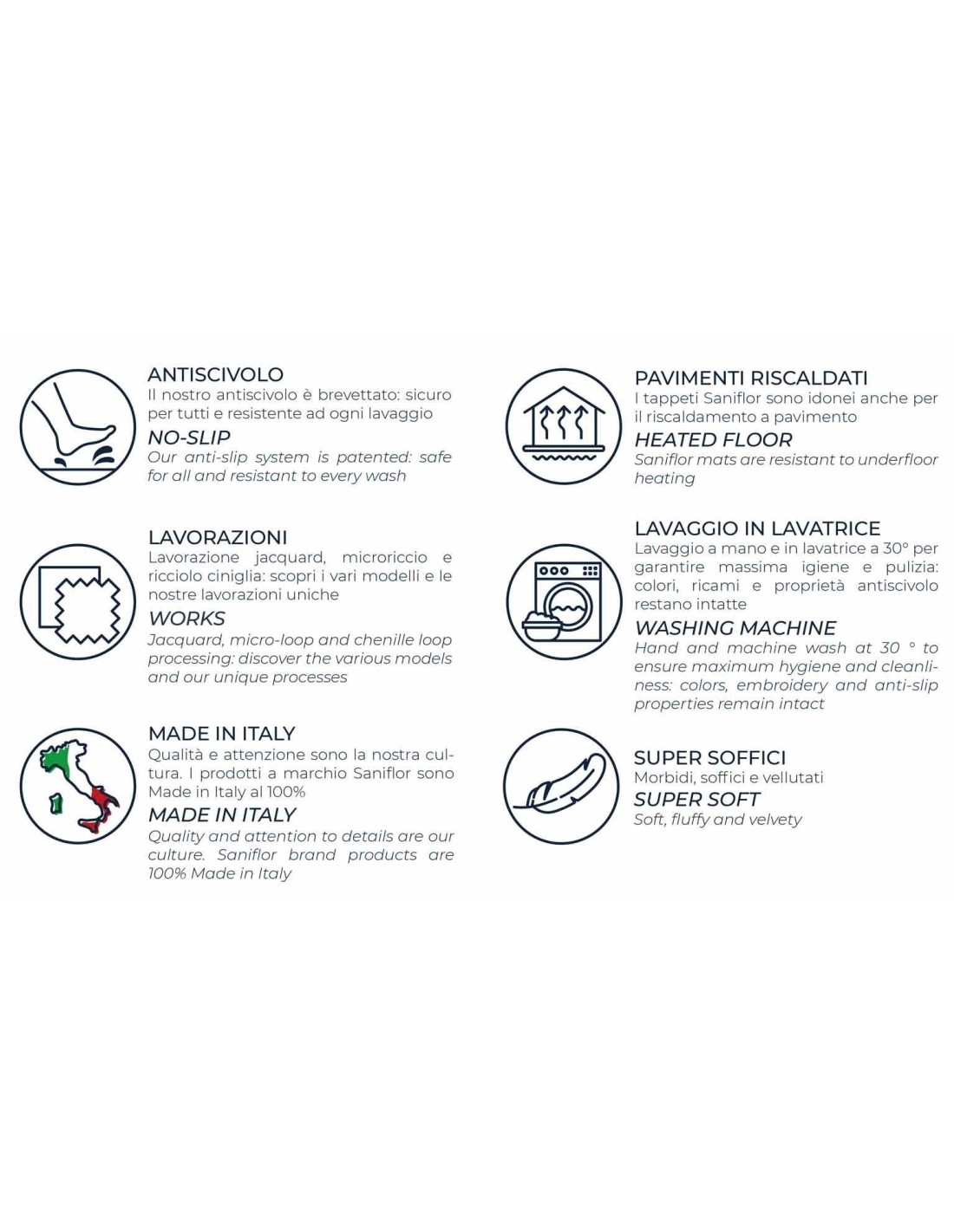 Hergestellt mit Tufting Weberei und ergänzt durch eine Finishing-Behandlung, die manuell jede Unvollkommenheit beseitigt, auf der Rückseite mit einer permanenten Rutschfestigkeit ausgestattet, die maximale Sicherheit für diejenigen garantiert, die darauf gehen.