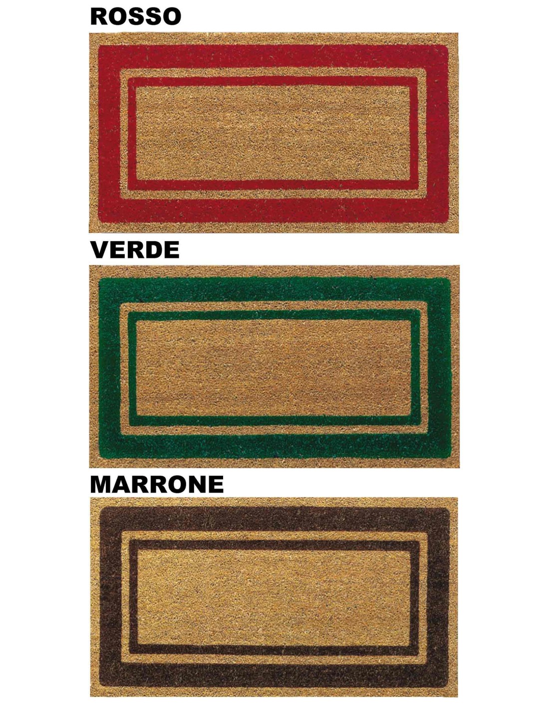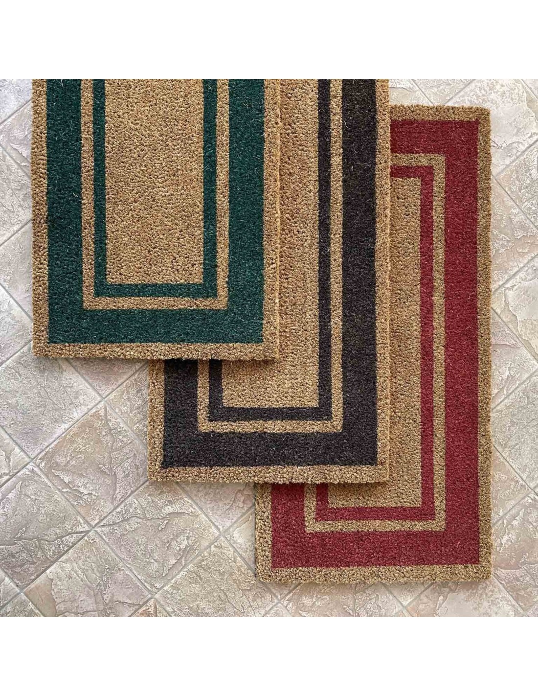 Natürliche Kokosnuss-Fußmatte mit klassischem Geschmack, die natürliche Farbe der Kokosnuss ist mit einem zweifarbigen Quadrat verziert und wird in verschiedenen Farben und in verschiedenen Größen angeboten..