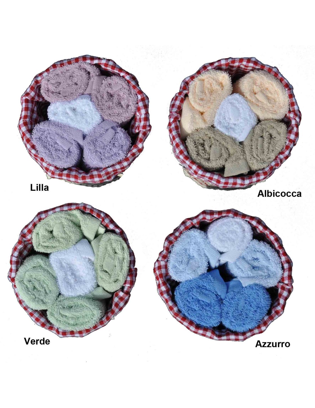 Ein niedlicher Weidenkorb in dunklen Farbtönen, bedeckt mit einem weiß-rot karierten Canvas und garniert mit einem gewellten Stoffetikett, das an großmütterliche Konserven erinnert, enthält ein Set von 5 Waschbecken in einer Mischung von Farbtönen.