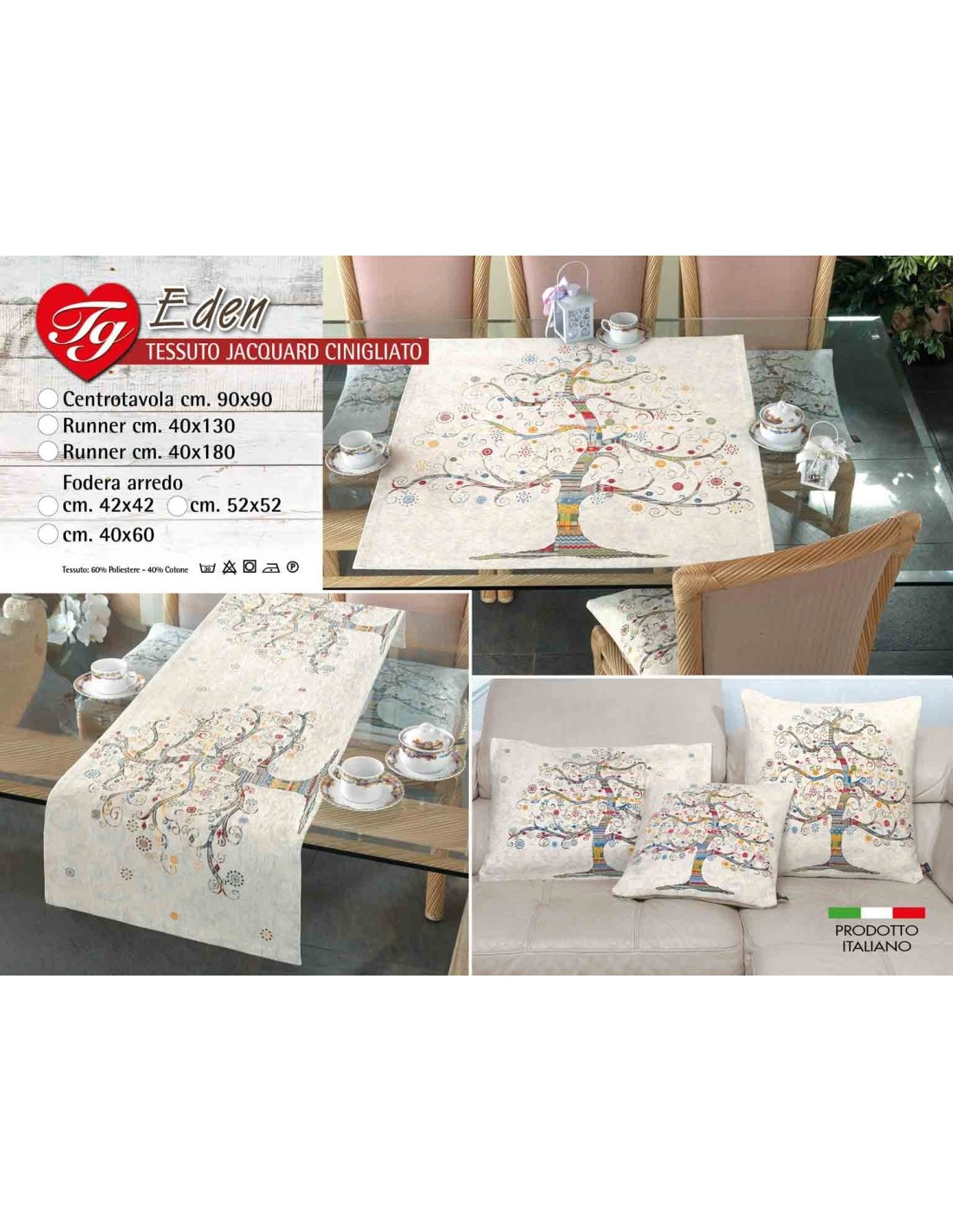 Das obere Gesicht ist in einer Cnille,anmutig geschmückt mit dem Baum des Lebens, dessen Farben sich vom elfenbeinfarbenen Hintergrund abheben. Das Cinilla-Garn verleiht dem Kissenbezug einen Hauch von Brillanz und samtigen Reliefbewegungen.