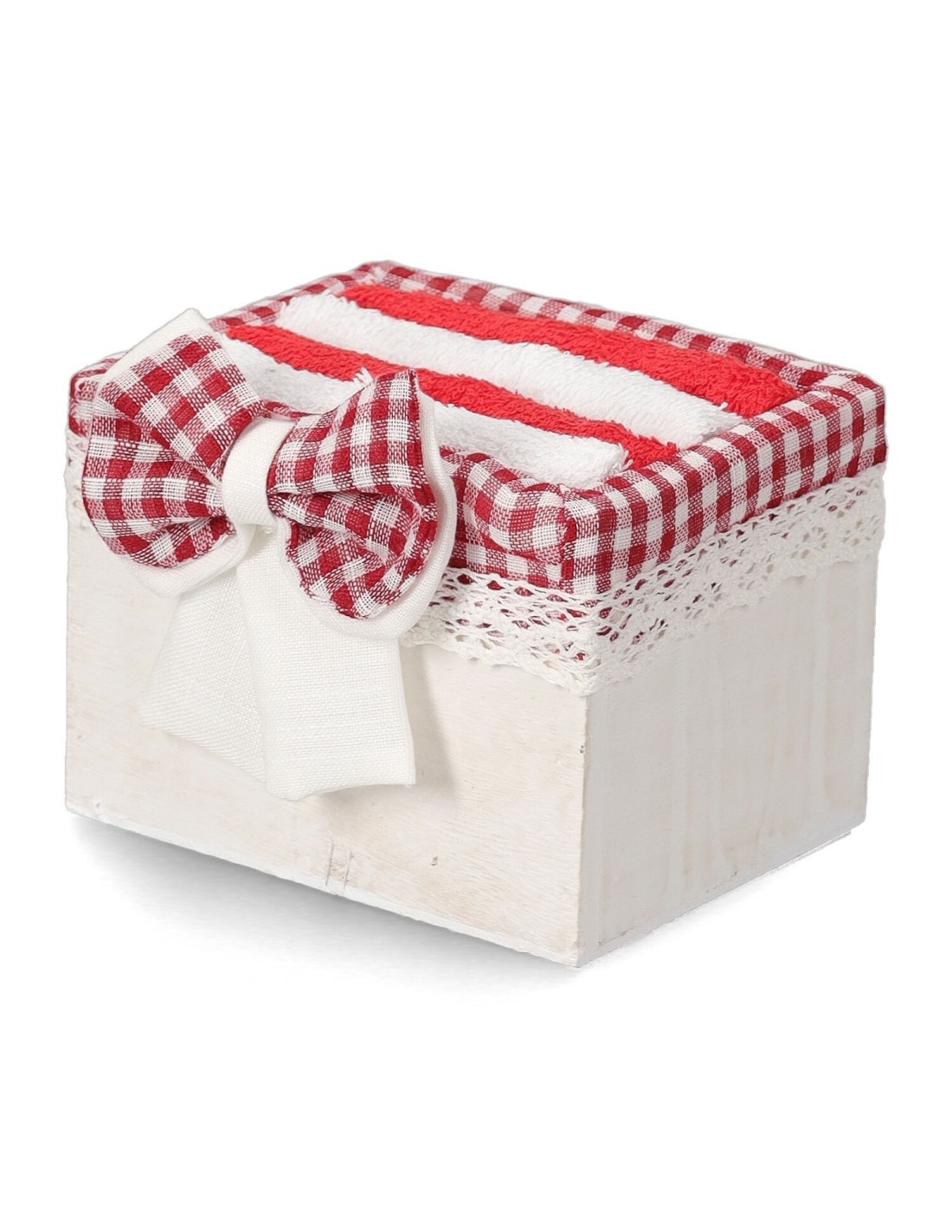 Ein komfortables und anmutiges Set, das 4 30x30cm (2 weiße und 2 rote) Wattewäscher in einem Holzkorb mit den Maßen 11x11x14cm enthält, der schön mit einer weiß-rot karierten Schleife geschmückt ist.