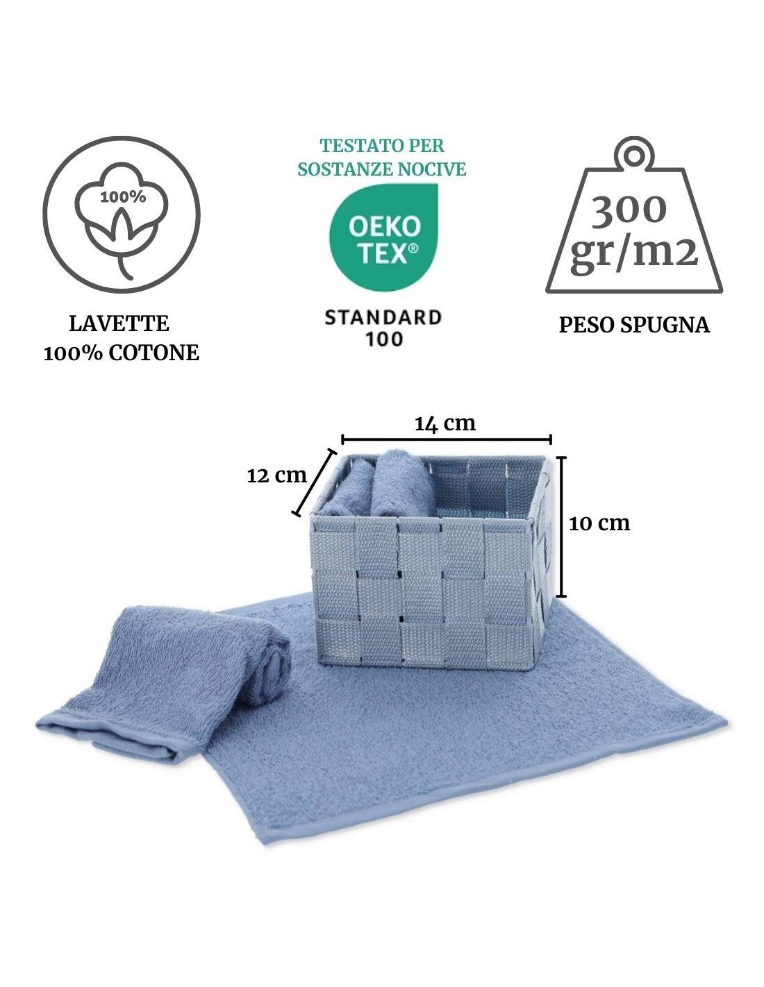 EIGENSCHAFTEN: Waschlappen aus reiner Baumwolle mit Frotteeverarbeitung von 30x30 cm, aufgerollt und in einen geflochtenen Korb gelegt, der an Rattan erinnert. Der Korb misst 12x14x10 cm..