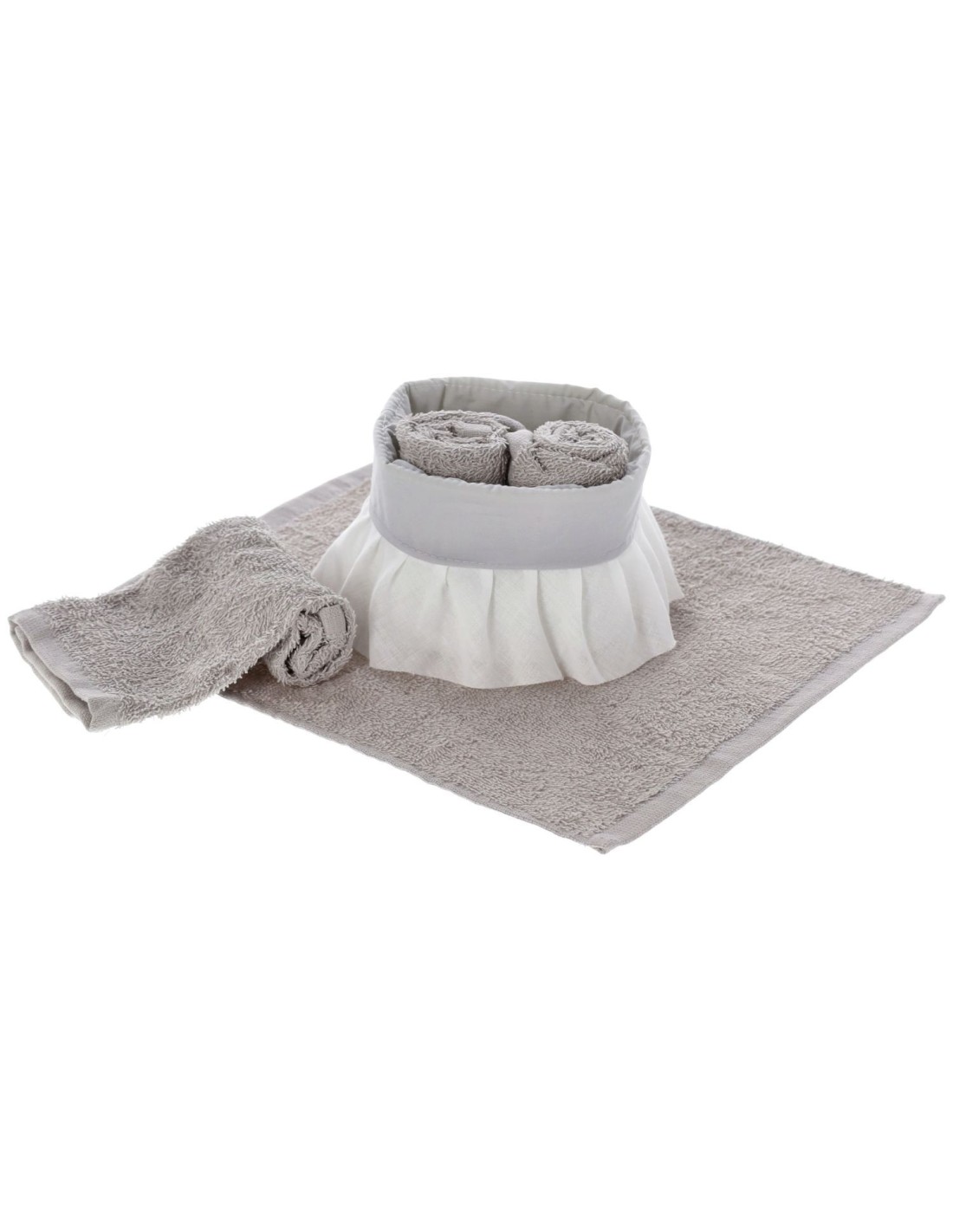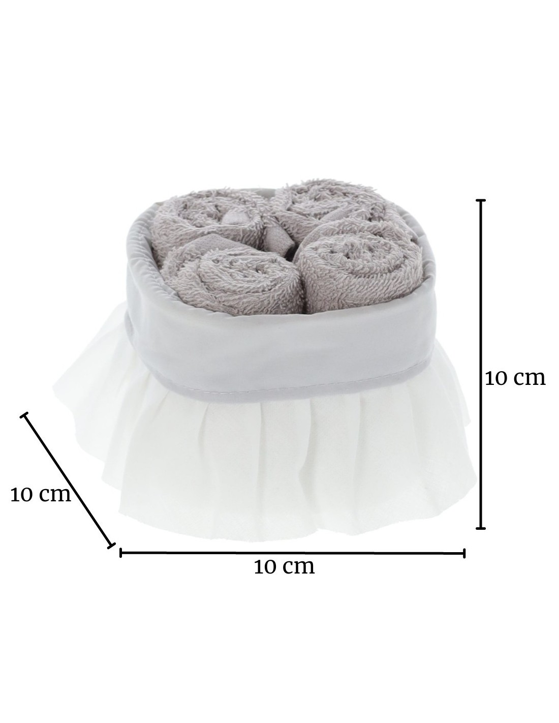MASSE: Weißer Stoffkorb mit einem Durchmesser von 10 cm und einer Höhe von ca. 10 cm, verziert mit einer kontrastierenden Bordüre, die an die Farbe der Lavette erinnert, und schön garniert mit einem weißen Faltenrock. Enthält 4 kleine Baumwollhandtücher 30x30 cm. Erhältlich in 2 Farben..