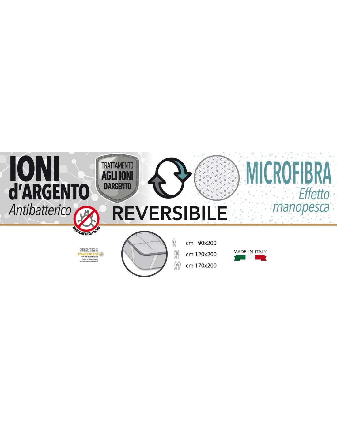 DOUBLE COATING: auf der einen Seite bielastisches Gewebe veredelt SILVER, antibakterielle Behandlung mit dauerhaftem Schutz und resistent gegen Waschen, völlig ungiftig, die vor der Entwicklung von Milben schützt und die Bildung von Schimmel hemmt; die andere aus weicher Mikrofaser, die einen angenehmen Pfirsichhandeffekt ergibt. Doppelte Nutzungsmöglichkeit..