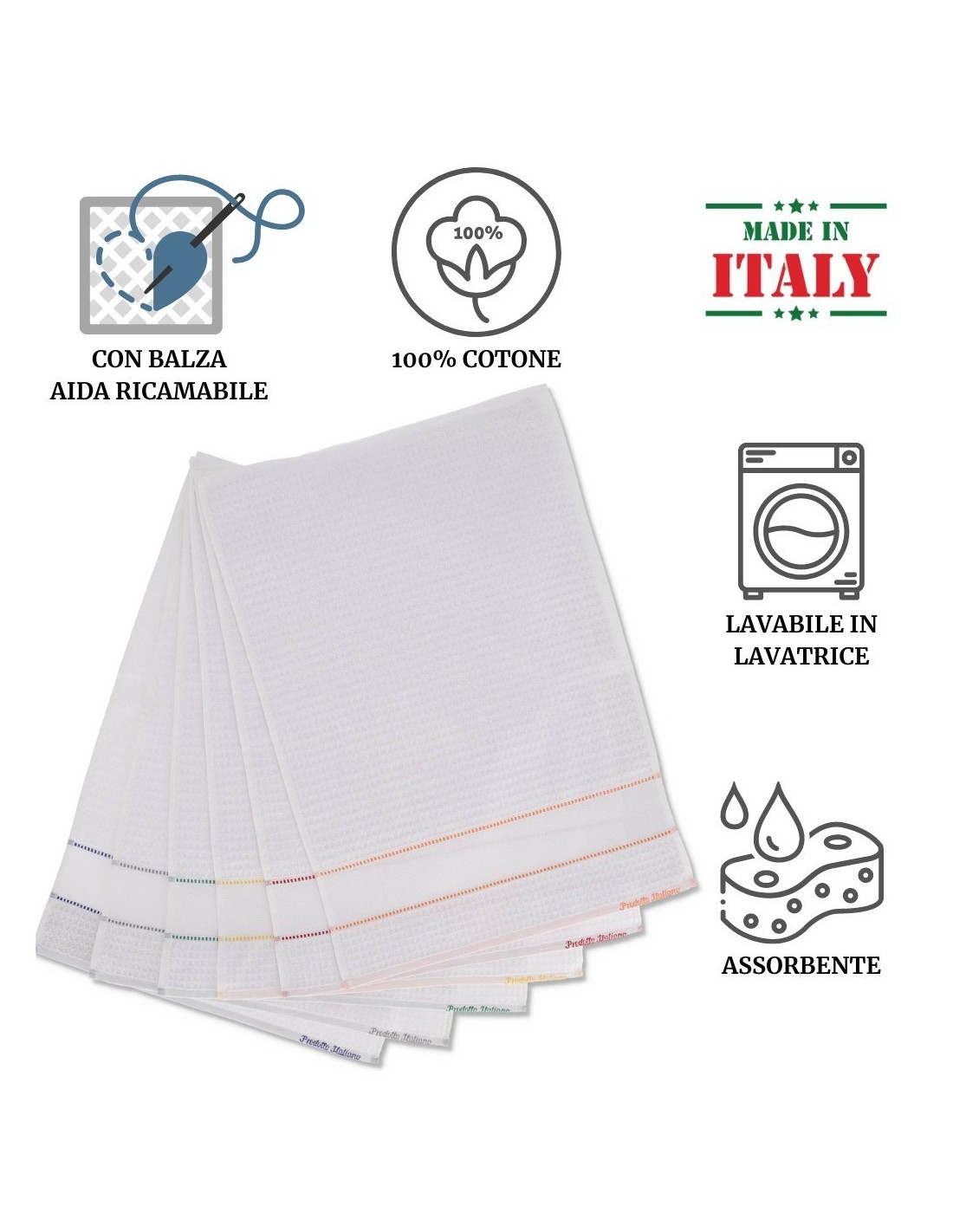 Das Set enthält 6 Geschirrtücher mit den gleichen Eigenschaften, Sie können wählen zwischen WEISS, wo das Geschirrtuch nur die Farbe liefert, um den Volant zu umrahmen, in 6 verschiedenen Farbtönen oder FARBEN, bei denen das gesamte Geschirrtuch farbig ist. Der AIDA Volant ist bei den Farben milchig-weiß, während er bei den weißen Farben offener ist..