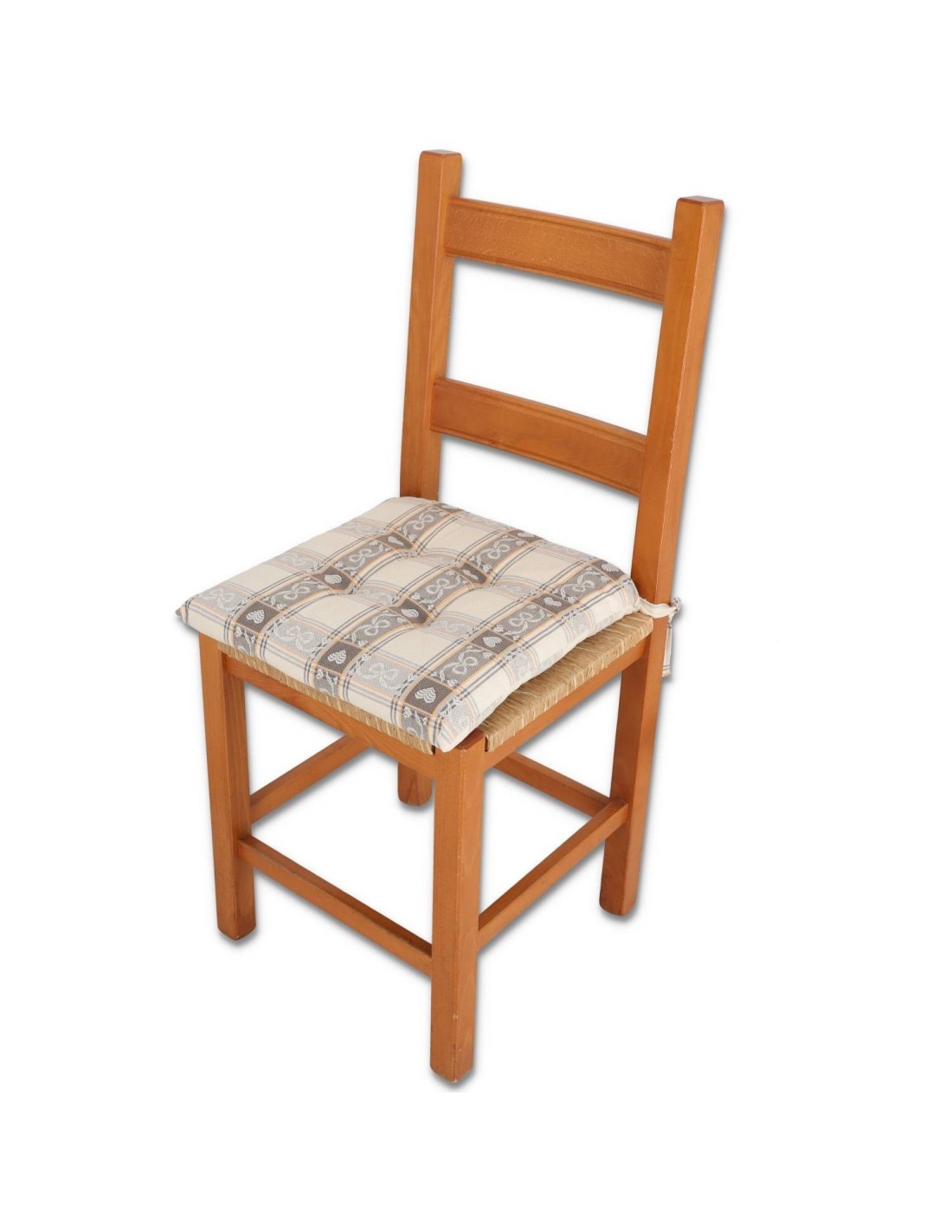 Küchenstuhlkissen aus Jacquardstoff, die mit einer Tischdecke kombiniert werden können.