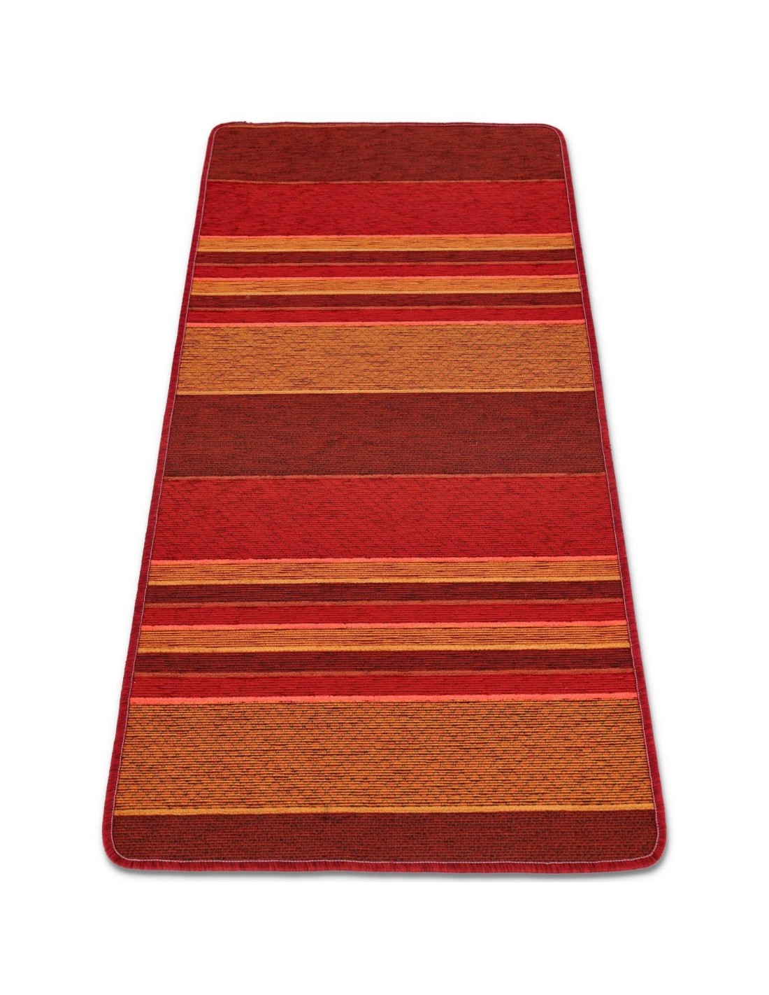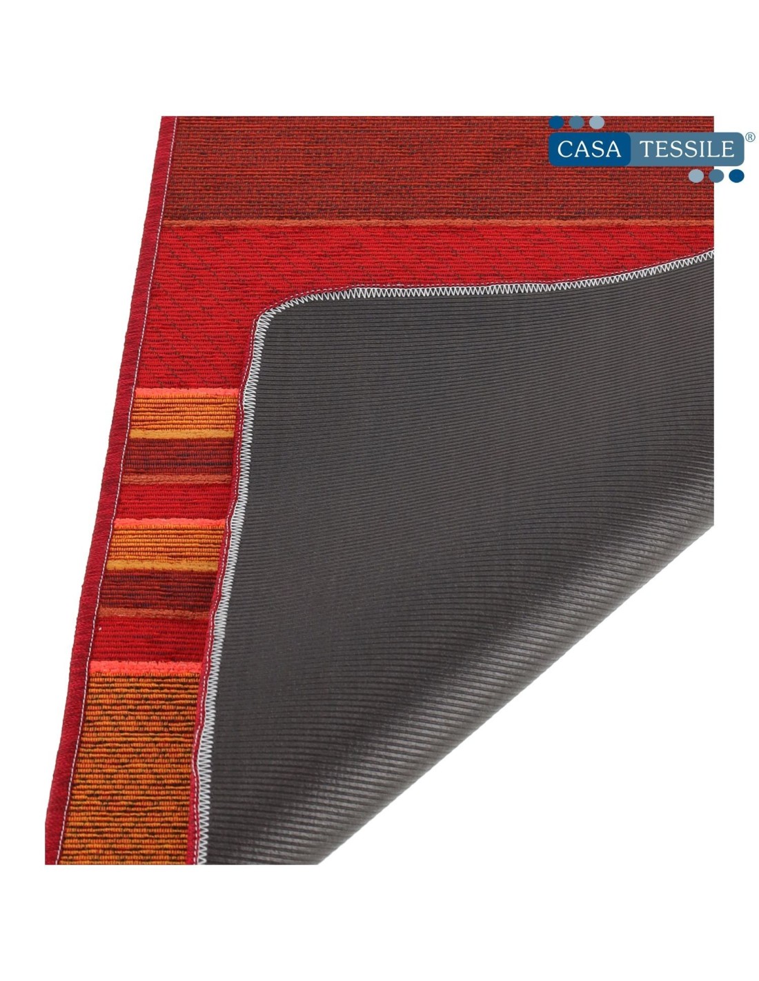 FUNKTIONEN: Aus Jacquard-Stoff mit Chenille-Garnen mit gestreiftem Design, das nicht gedruckt, sondern in Weberei hergestellt und mit einem rutschfesten thermoplastischen Boden verbunden ist, um einen widerstandsfähigen und praktischen Teppich zu schaffen, der fest auf dem Boden liegt und vor allem leicht in der Maschine waschbar ist. Overlock rundum eingefasst mit abgerundeten Ecken und nur 5 mm. dick..
