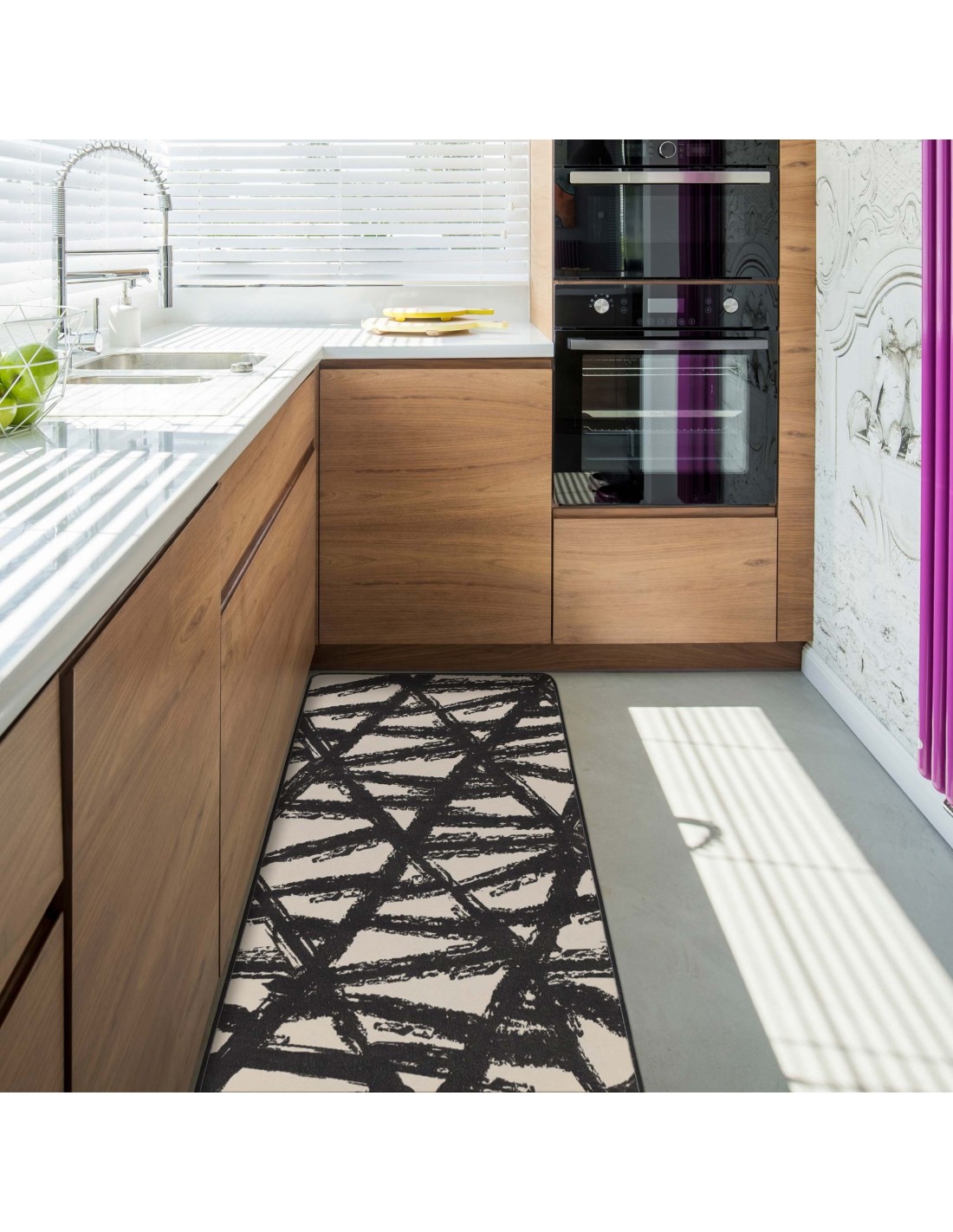 FUNKTIONEN: Ein moderner Läufer mit einem einfachen, aber fesselnden Muster. Die Basis des Teppichs ist glatt und mit einer neutralen Farbe, auf der die Bewegung der schwarzen Streifen im Relief und mit einer samtigen Hand geboren wird, die beide beim Weben mit der Verarbeitung von Jersey entstehen. Gepaart mit einer gummierten, rutschfesten Unterlage , um sie fest und stabil auf dem Boden zu machen, und mit Overlocks am gesamten Umfang mit abgerundeten Ecken versehen..