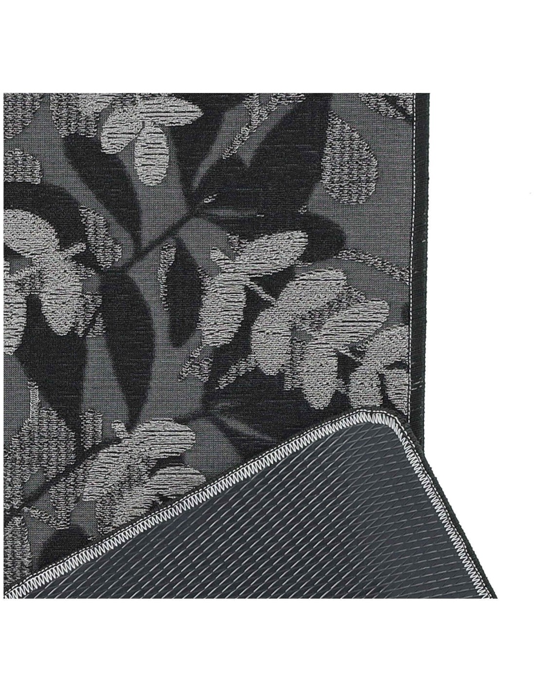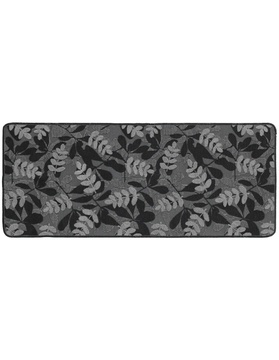 Ein hübscher Küchenteppich mit Blättern mit einer samtigen Hand und im Relief im Vergleich zu dem einfarbigen Hintergrund, der sich glatt anfühlt.
