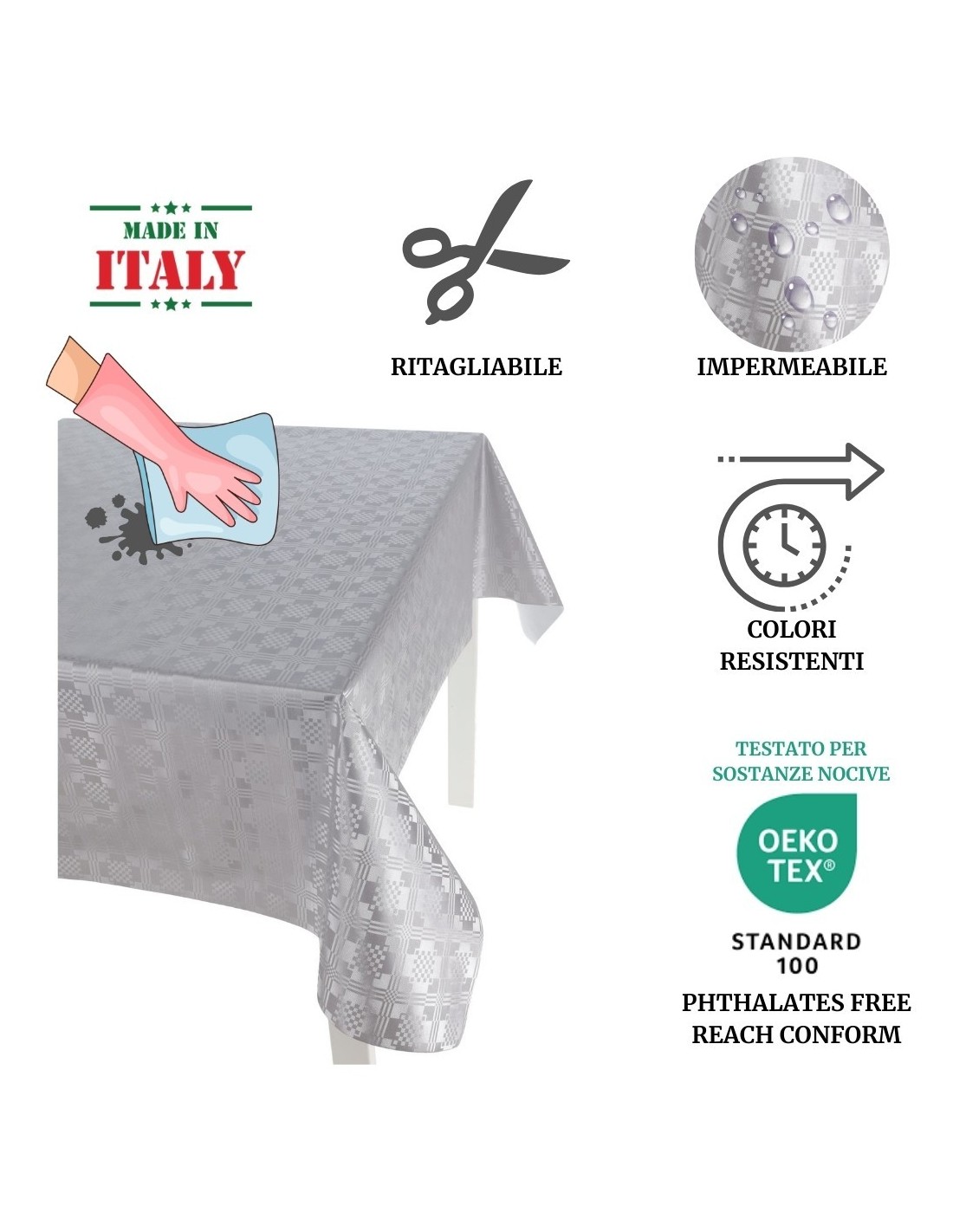 FUNKTIONEN: Vollständig in Italien hergestellte Tischdecke, die aus einem bedruckten Vinylblatt besteht und mit Vliesstoff laminiert ist. Ohne Veredelung verkauft, zieht sie nicht aus, roh geschnitten in vielen Standardgrößen und sogar als Meterware für eine maßgefertigte Tischdecke oder für größere Tische..