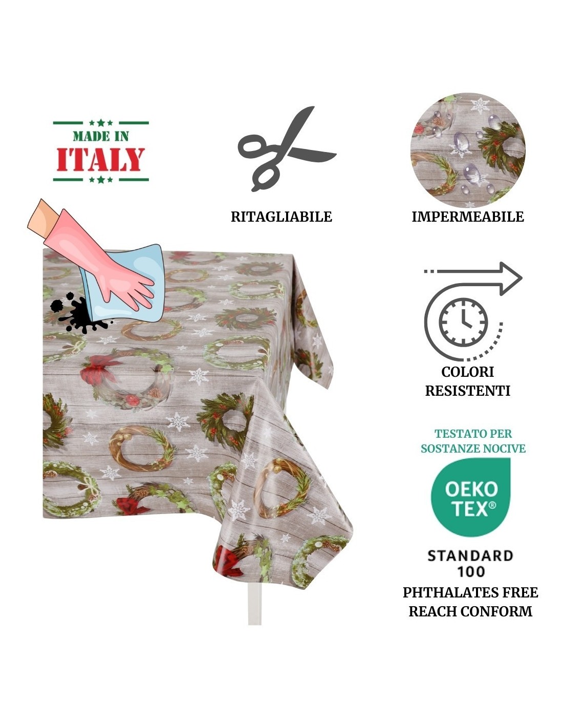 FUNKTIONEN: Vollständig in Italien hergestellte Tischdecke, die aus einem bedruckten Vinylblatt besteht und mit Vliesstoff gekoppelt ist. Ohne Veredelung verkauft, verrutscht es nicht, roh geschnitten in vielen Standardgrößen und sogar als Meterware für eine maßgeschneiderte Tischdecke oder für die zahlreichsten Tische..