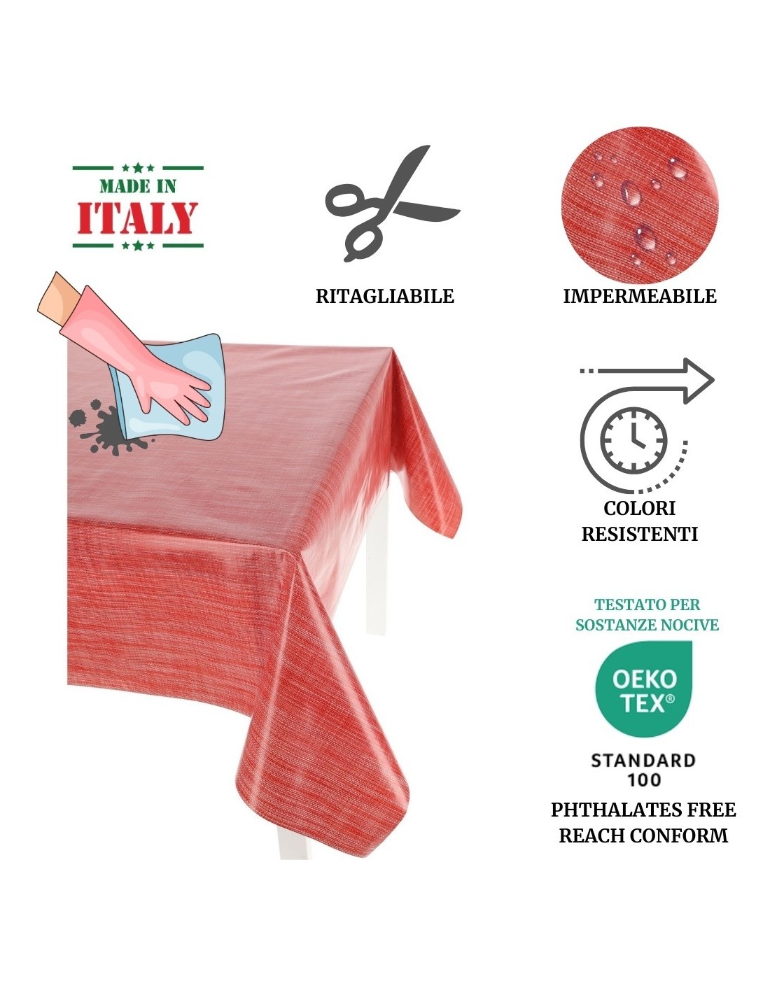 FUNKTIONEN: Vollständig in Italien hergestellte Tischdecke, die aus einem bedruckten Vinylblatt besteht und mit Vliesstoff laminiert ist. Ohne Veredelung verkauft, zieht sie nicht aus, roh geschnitten in vielen Standardgrößen und sogar als Meterware für eine maßgefertigte Tischdecke oder für größere Tische..