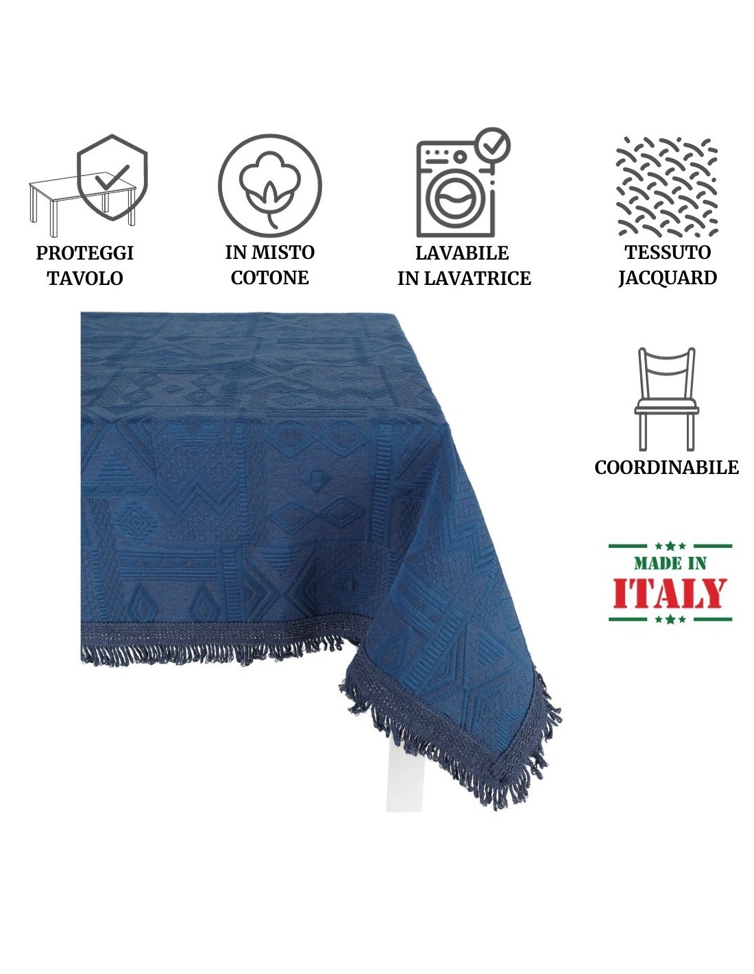 Das geometrische Muster mit ethnischer Anziehungskraft wird durch ein Fransen-Finish auf allen Seiten verstärkt.