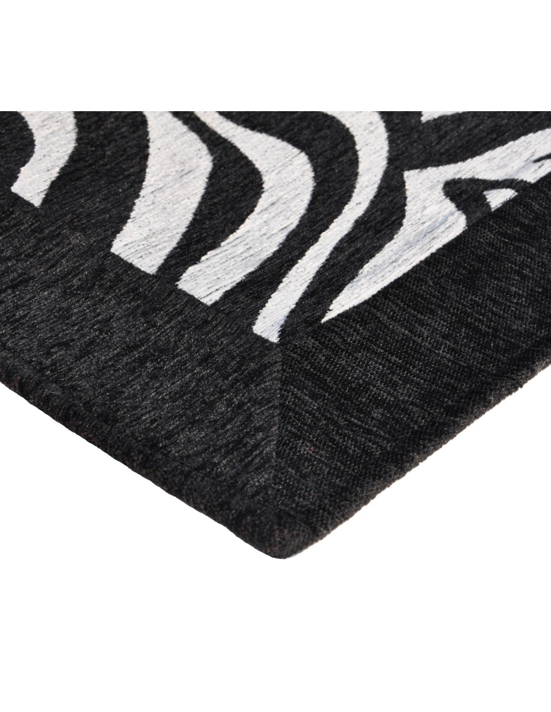 Hilado en chenilla blanco y negro con un juego de fantasía de cebra enmarcado por una franja negra y con la parte inferior antideslizante.