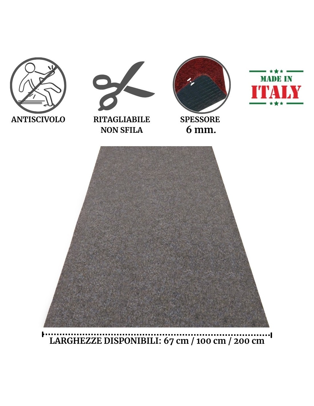 Puedes elegir entre 3 anchos, 67, 100 y 200 cm. y la unidad de compra es el metro lineal con unidad completa, si quieres un corredor de 10 metros de largo, por ejemplo, ingresa 10 en el campo de la unidad, si en cambio necesitas una medida intermedia como 5.5 metros. Tendrás que introducir 6 unidades de compra y decirnos tu talla exacta en las notas del pedido o puedes cortarla cómodamente como quieras..