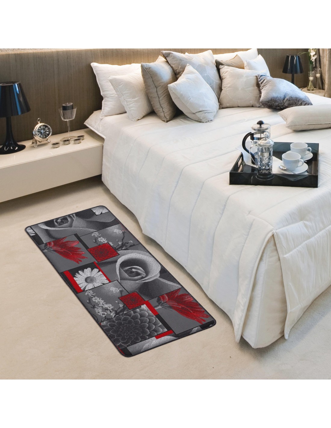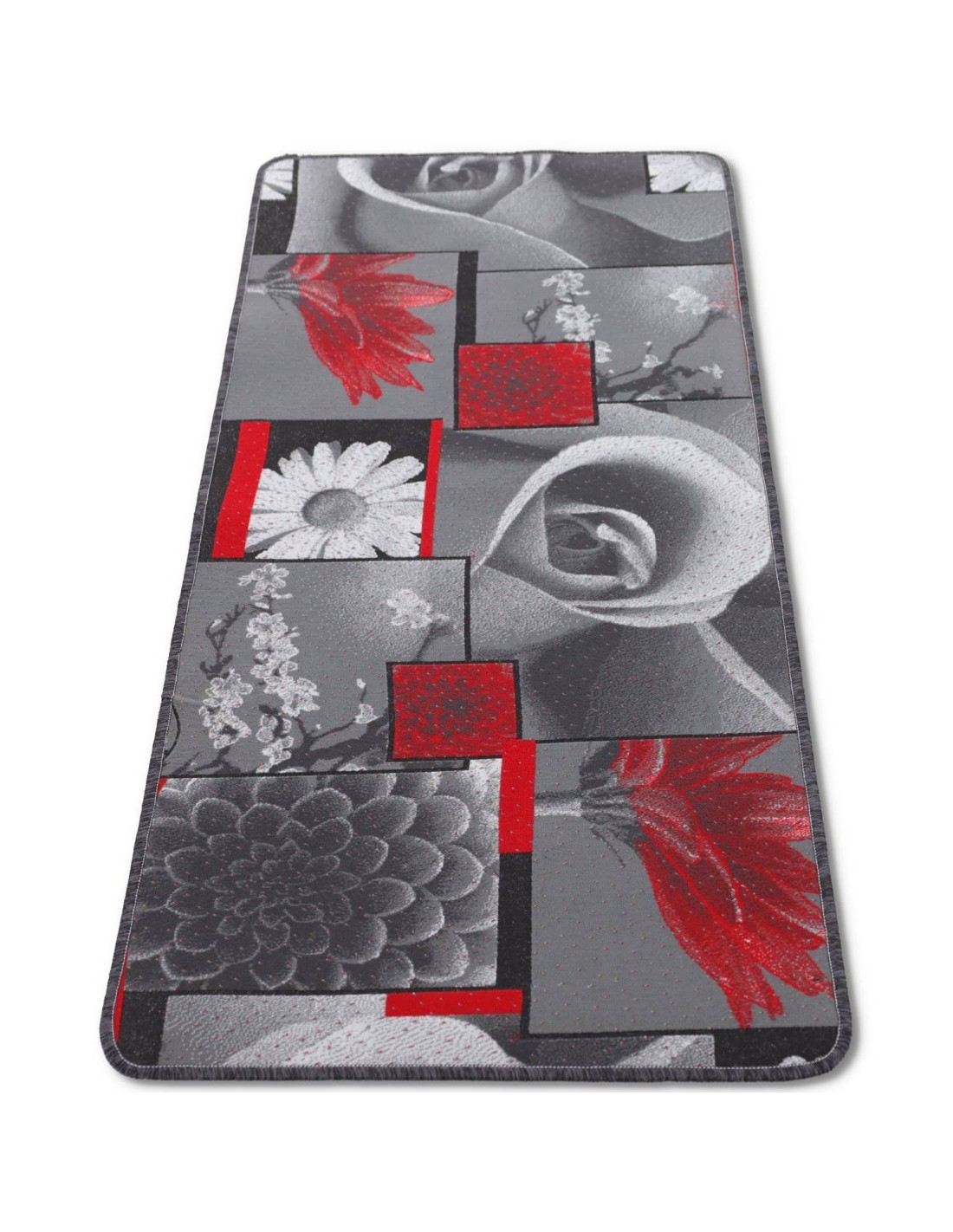 FUNCIONES: Alfombra en tonos grises y toques de rojo aquí y allá. Con una mano aterciopelada cuya lona y diseño se crea en tejido con el procesamiento del jersey, unido a un sustrato engomado antideslizante para hacerlo firme y estable en el suelo y acabado con overlocks en todo el perímetro con esquinas redondeadas..