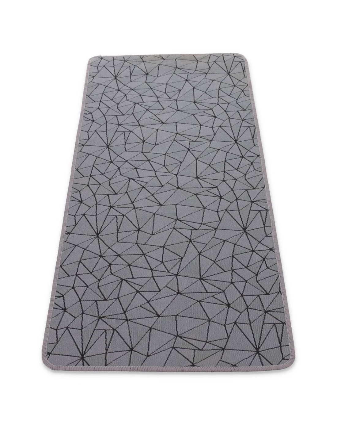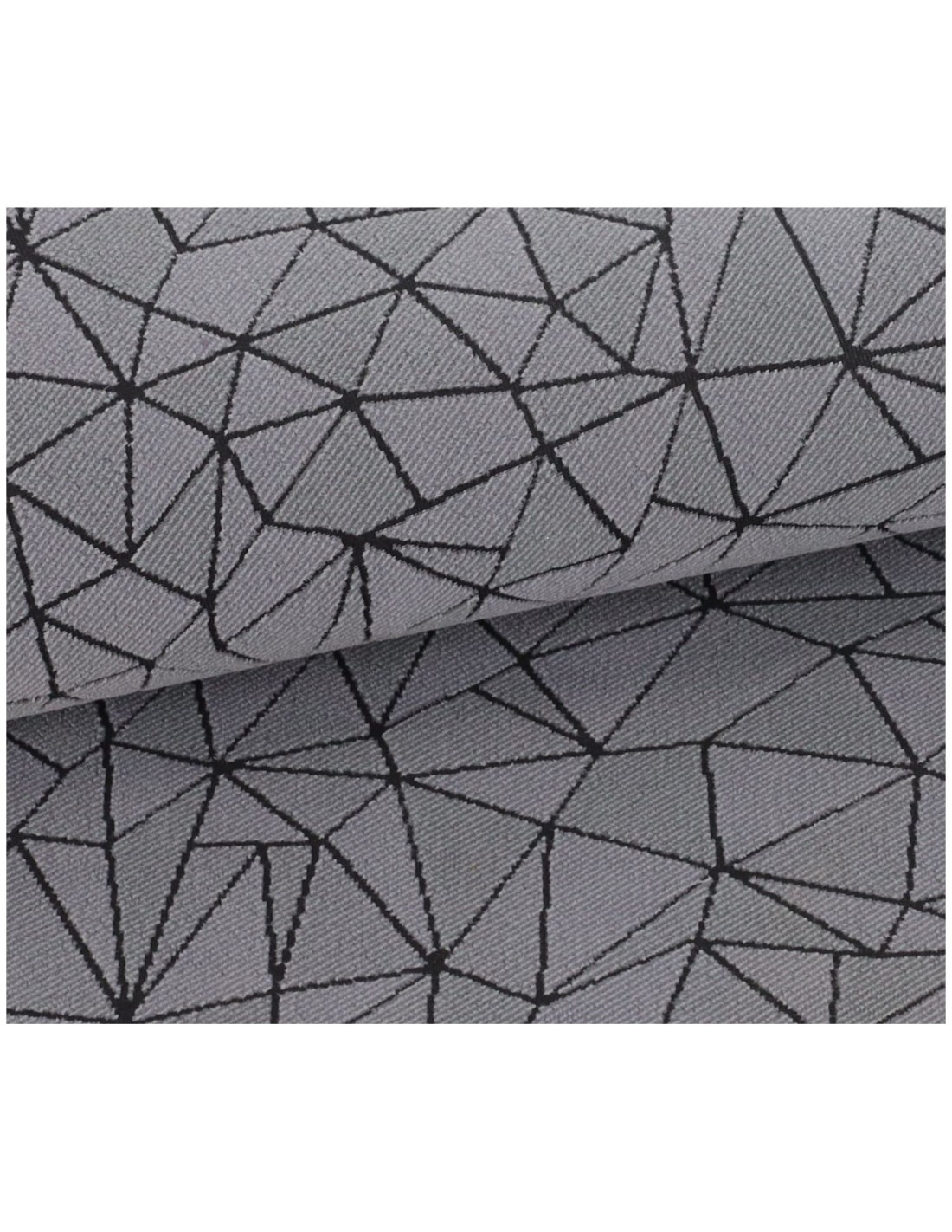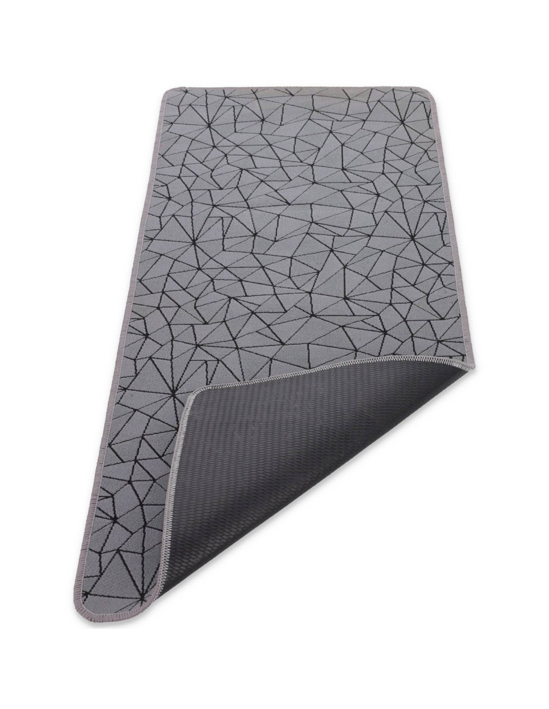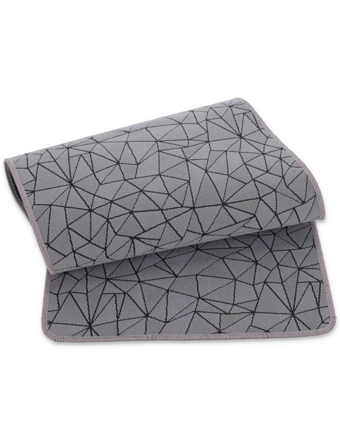 FUNCIONES: Alfombra multiusos con una mano aterciopelada decorada con un patrón geométrico creado en tejido con el procesamiento de jersey, junto con una base de goma antideslizante, rematada con overlocks en todo el perímetro con esquinas redondeadas, todo en 5 mm. grueso para que no estorbe y se puede lavar a máquina..