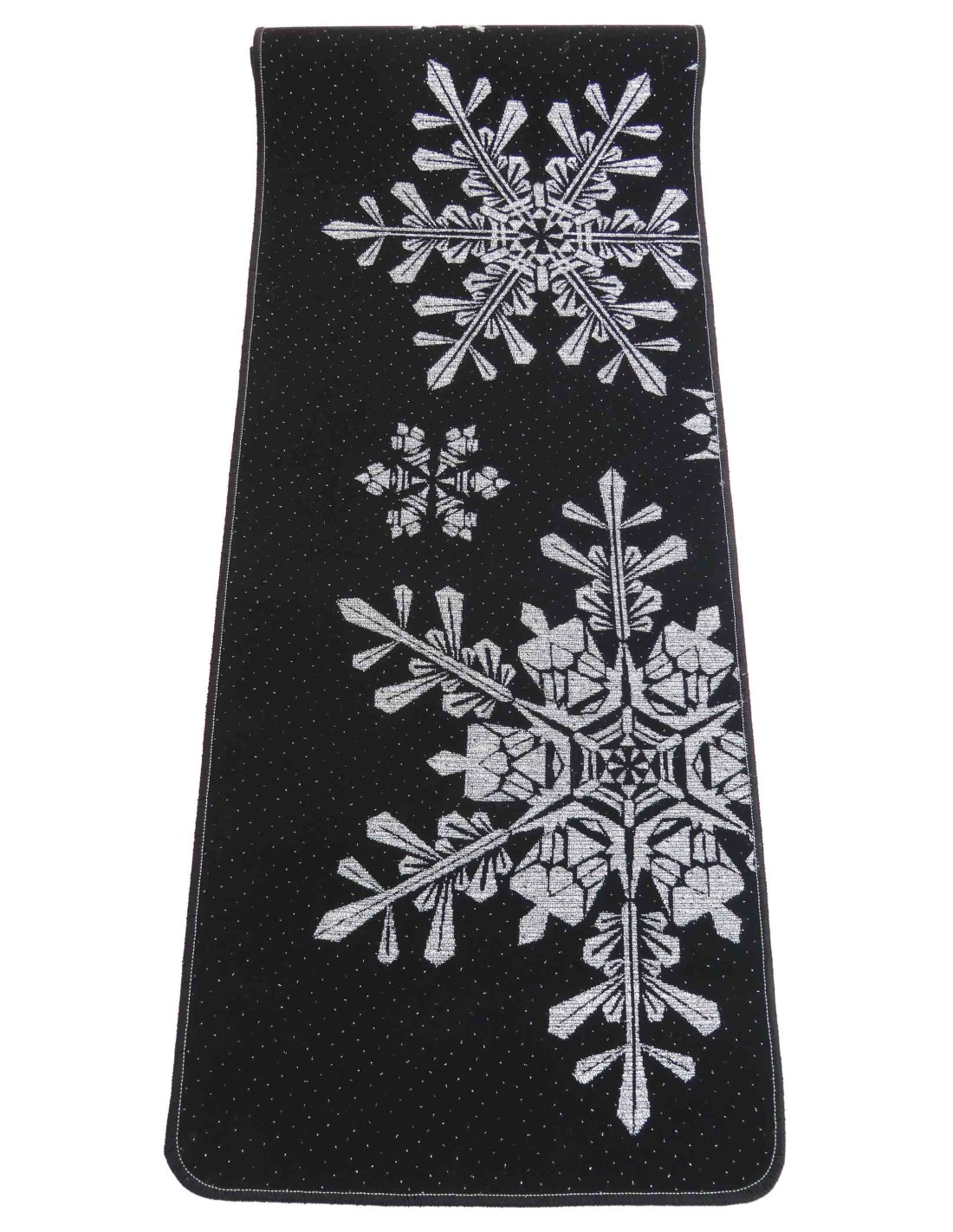 Brillante y brillante, una base aterciopelada negra salpicada de muchos puntos de luz como bajo una nevada y grandes cristales de hielo contrastantes y también brillantes gracias al uso de hilo lurex plateado. Un efecto que permanecerá inalterado con el tiempo, lavar después del lavado porque no se imprime pero se crea en el tejido. La posición de los cristales es aleatoria y variable según el tamaño elegido, la foto es sólo indicativa.