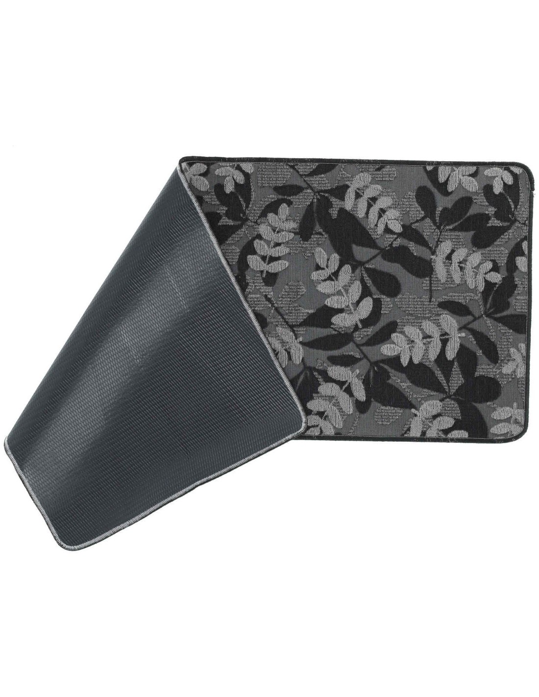 Una bonita alfombra de cocina con hojas con una mano aterciopelada y en relieve en comparación con el fondo de color sólido que es suave al tacto.