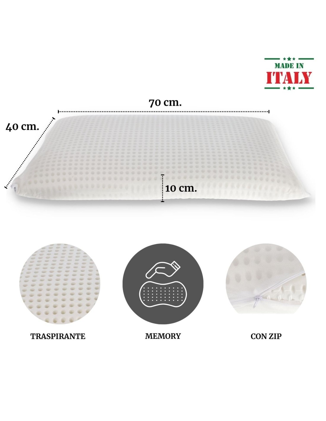 Guanciale fabricado íntegramente en Italia en material viscoelástico con taladro directo, tiene la clásica forma de jabón, que mide 40x70 cm. y mide unos 10 cm de altura..