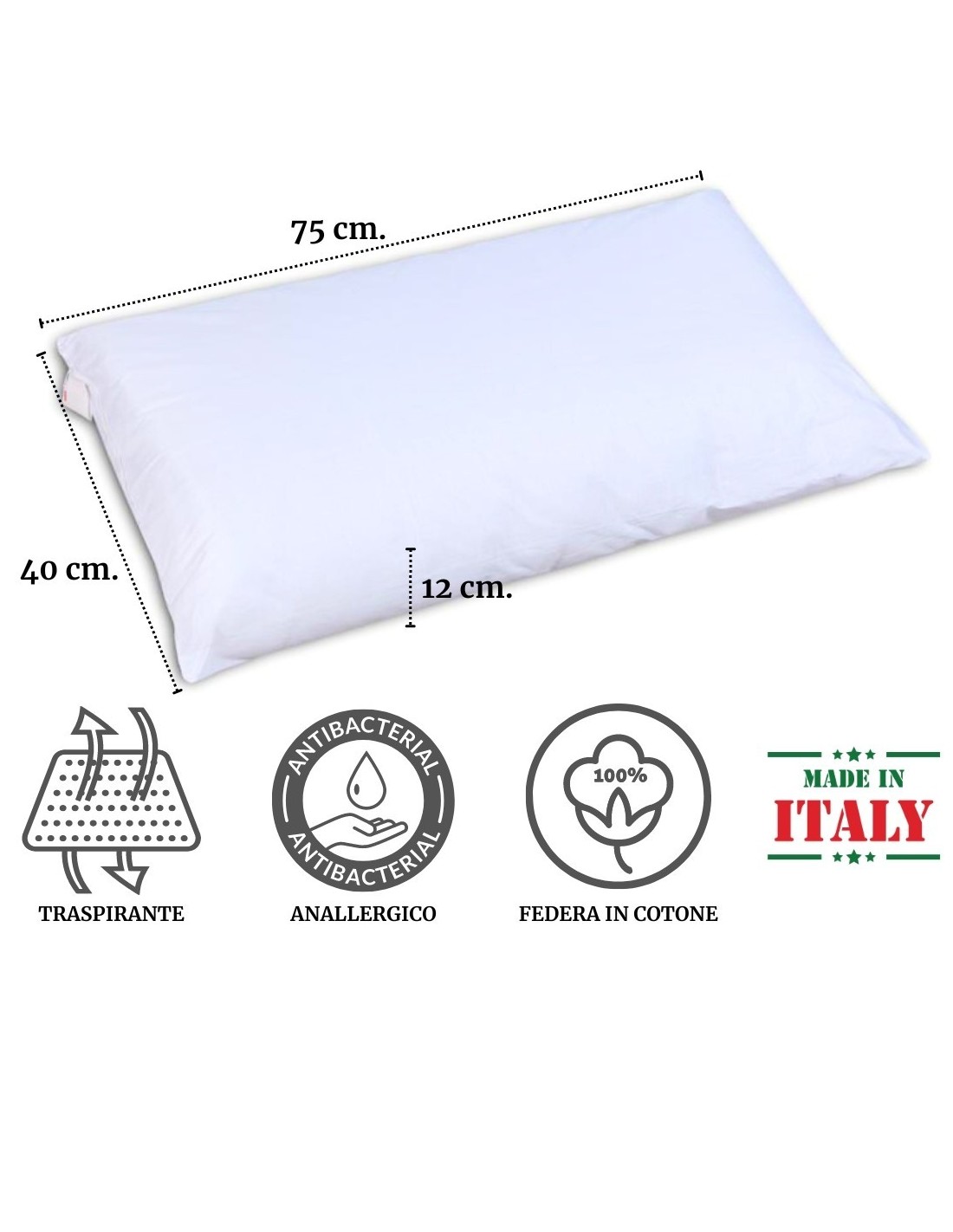 Cojín Guanciale fabricado en Italia con solapa cardada, de altura media fabricada en guata de poliéster de alta calidad..