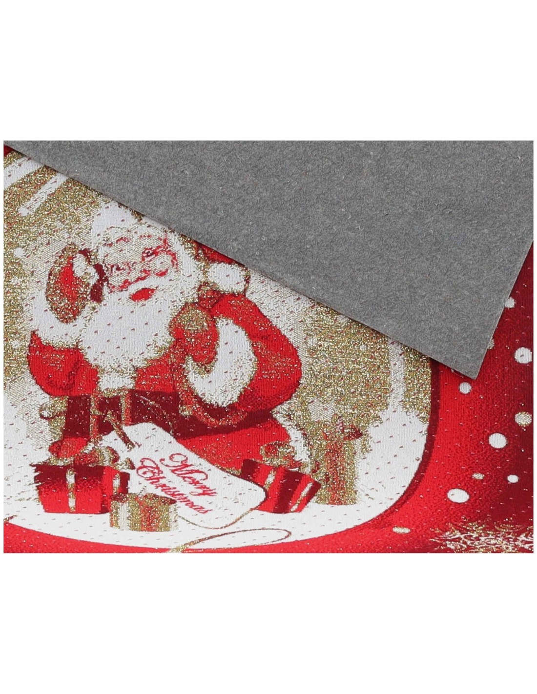 Una alfombra roja salpicada de cristales de luz gracias al hilo lurex que la hace brillante, con una gran decoración navideña en el centro con un simpático Papá Noel que desea felices fiestas.