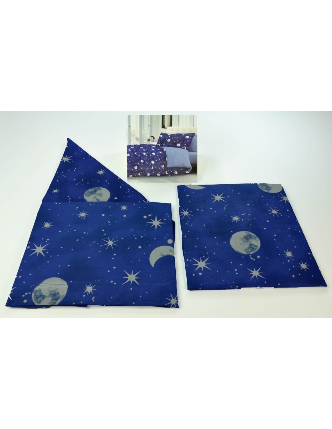 Una noche clara llena de estrellas con lunas y cuñas, decoraciones blancas que destacan basado en azul suave. Una bonita impresión de que está presente en todas las piezas de los completos y a ambos lados del funda de almohada.