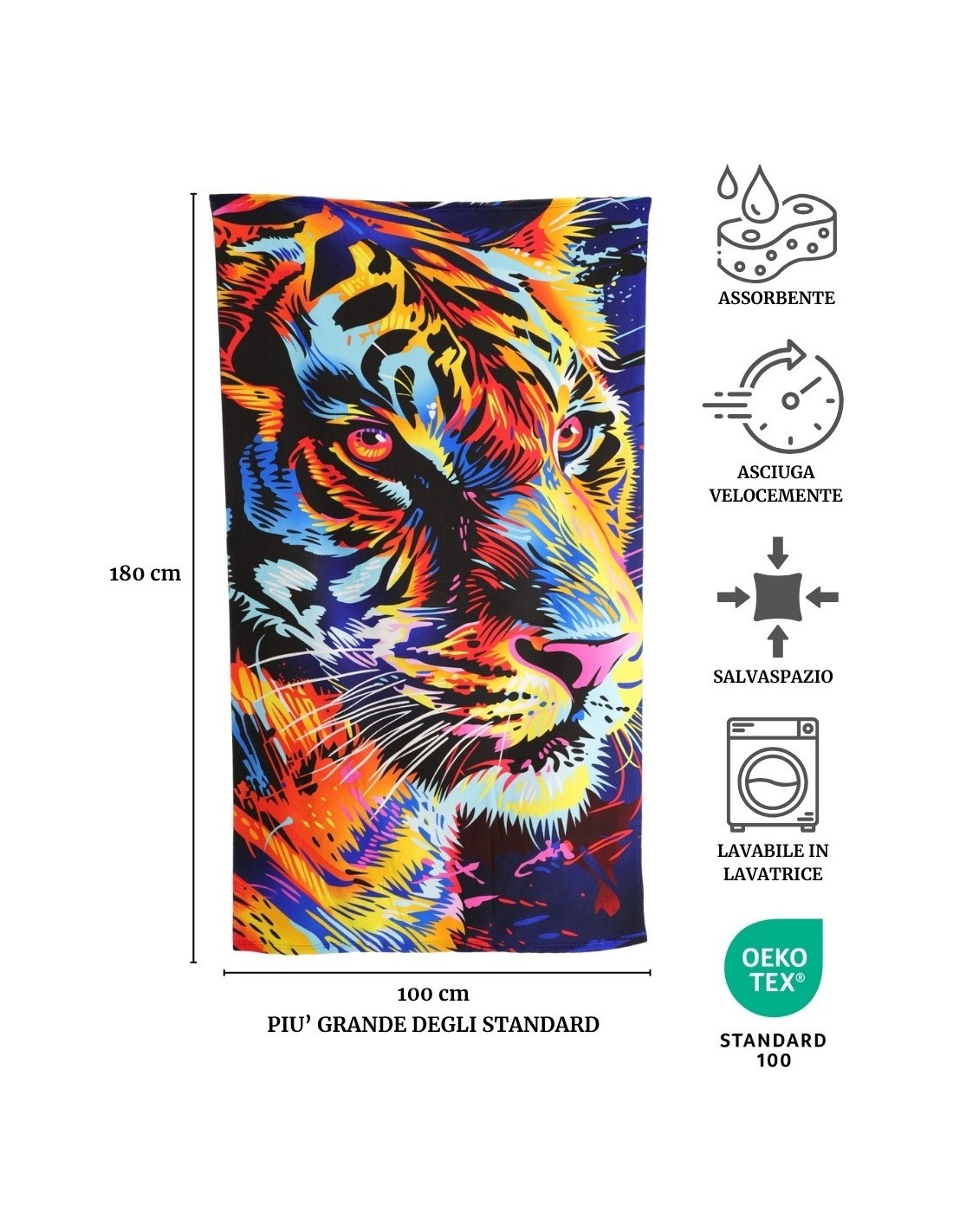 PROCESAMIENTO DE ESPONJAS: Pequeños rizos de microfibra que aumentan la superficie absorbente de la toalla de playa haciéndola más agradable y suave para la piel al mismo tiempo..