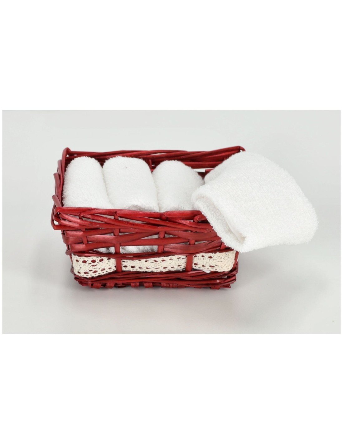 CARACTERÍSTICAS: Toallitas de puro algodón con tratamiento de rizo de 30x30 cm. En blanco, enrolle y colóquelo en una canasta de mimbre roja muy bien adornada con adornos. La cesta mide 13x17x9 cm..