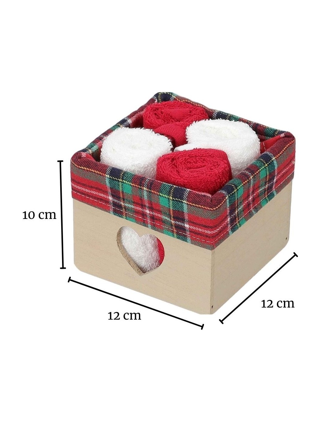 MEDIDAS: La cesta mide 12x12 cm. y mide 10 cm de altura, contiene 4 toallas de color sólido que miden 30x30 cm. cada una las cuales son en 100% algodón, 2 rojas y 2 blancas..