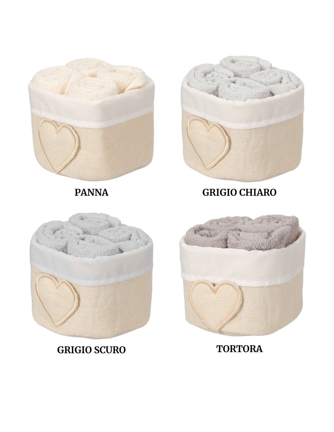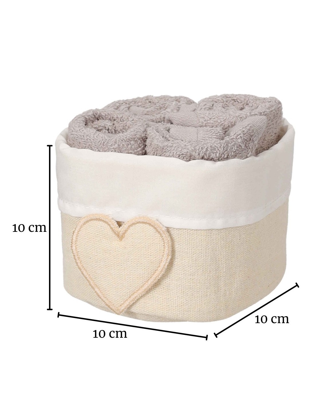 La cesta está creada a partir de un lienzo con una mano gruesa y color natural, el borde superior está acabado con unos bonitos adornos y completado por 1 corazón bordado, siempre en tela.