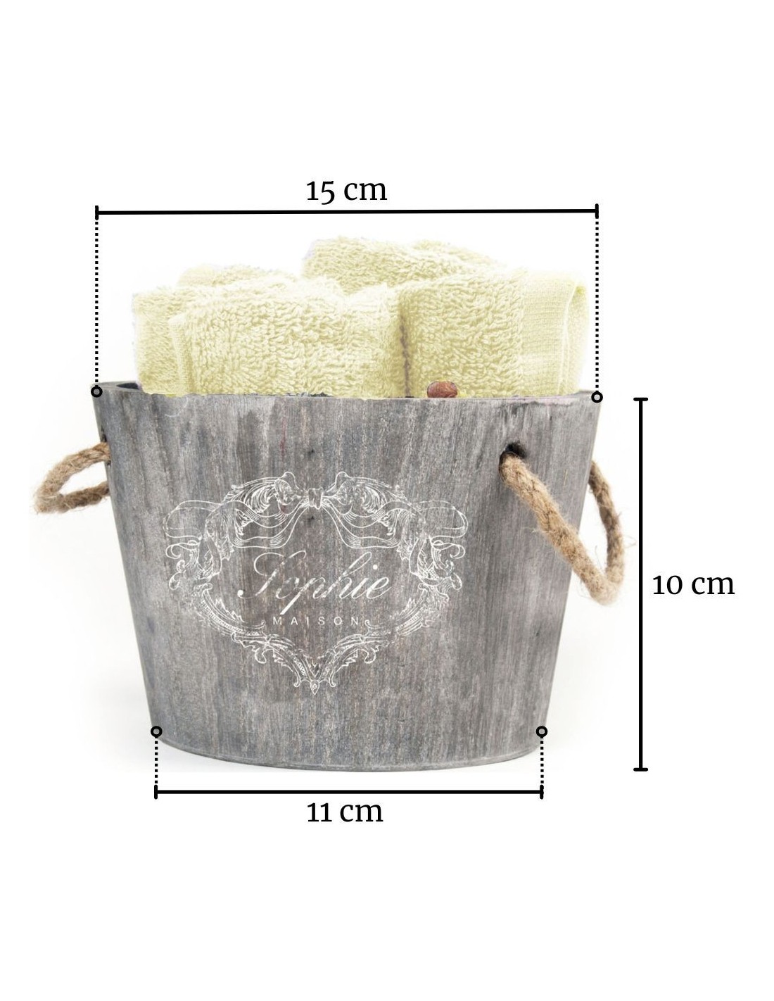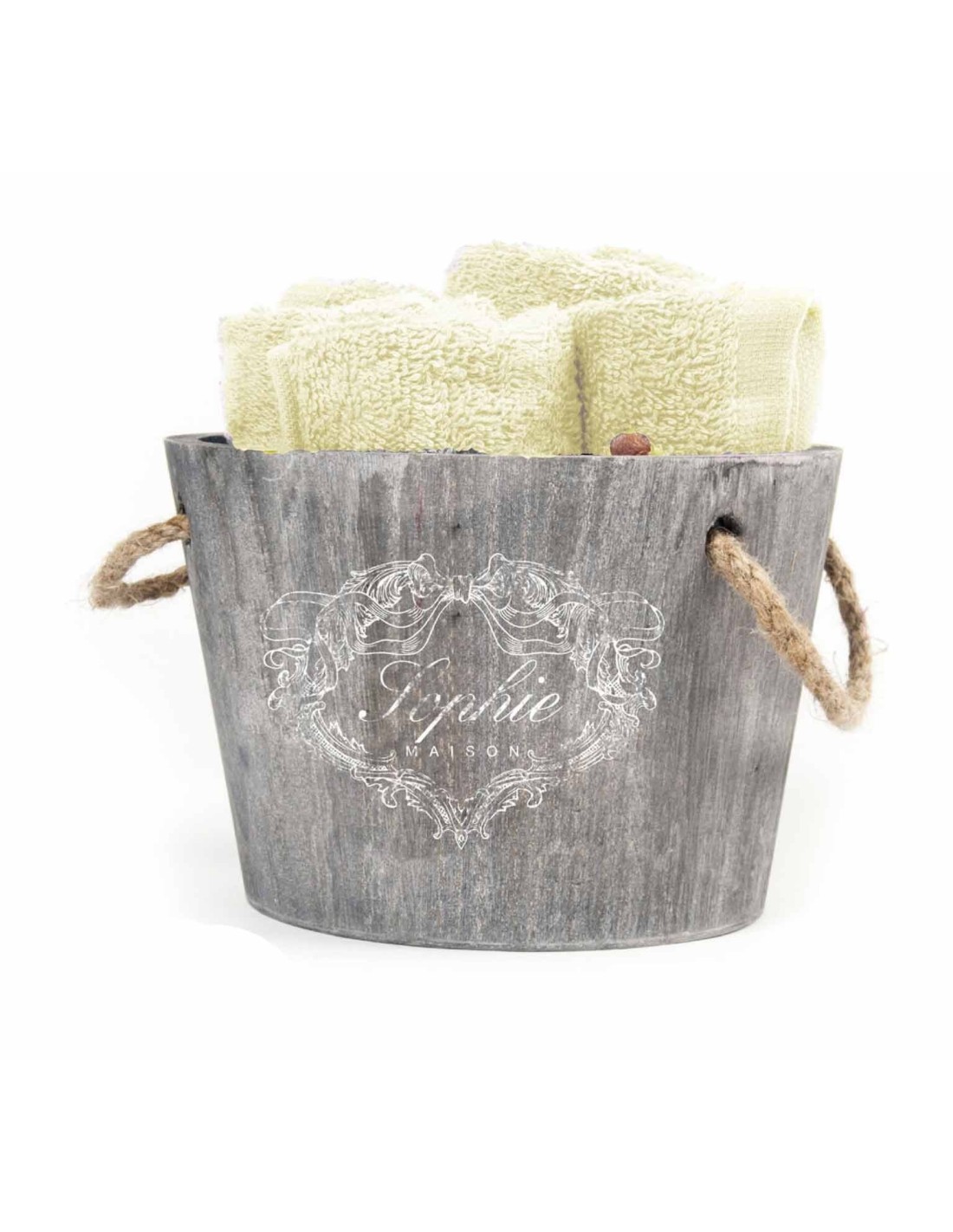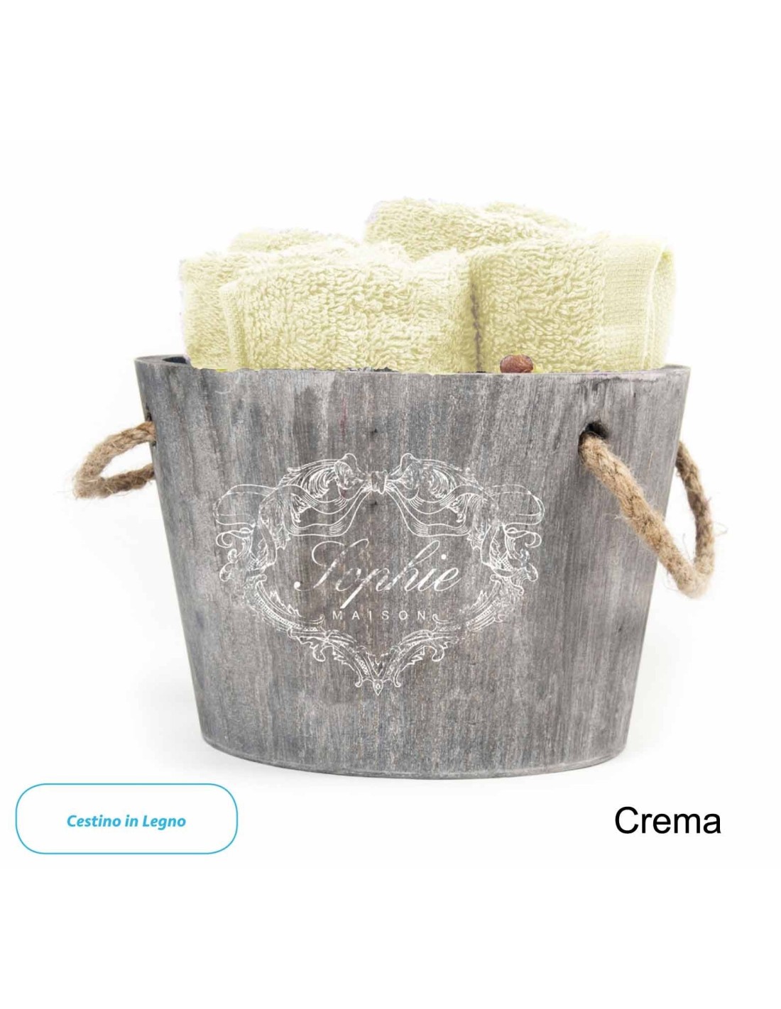 Composición: 100% algodón lavado de paños y cesta de madera.
