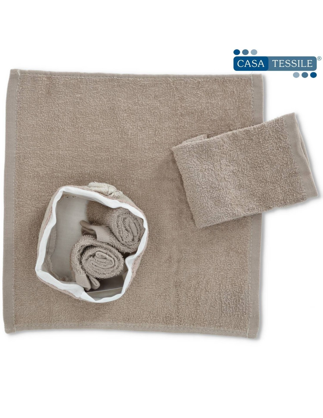 CARACTERÍSTICAS: Toallitas de puro algodón con rizo de 30x30 cm., enrolladas y colocadas en cesta. La cesta mide 13 cm de diámetro x 10 cm..