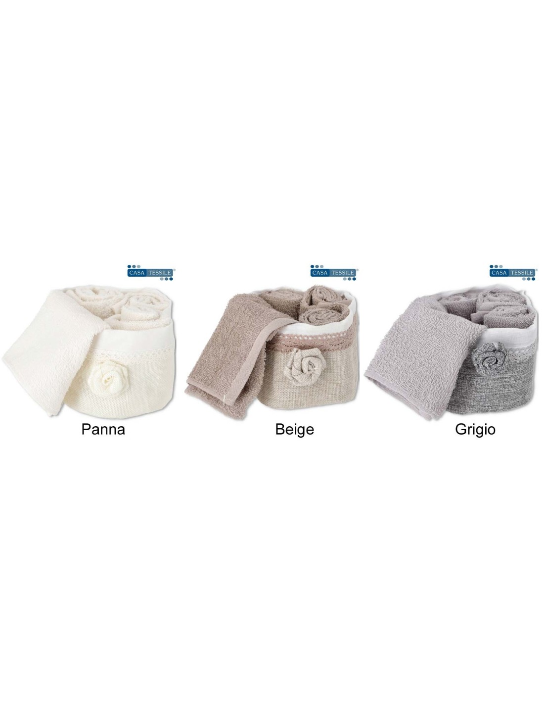 NANTES: Conjunto compuesto por 4 toallitas de rizo de algodón insertadas en una suave cesta de tejido jaspeado muy bien decorada con una solapa rematada con pasamanería y una rosa creada con el mismo tejido..