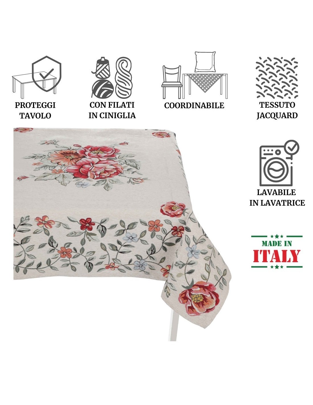 COORDINADO: Una colección de jacquard de chenilla con colores brillantes y patrones colocados para embellecer y hacer su hogar más funcional con artículos modernos y cautivadores: de hecho, además del mantel, están disponibles corredores, centros de mesa y forros de coordinación.