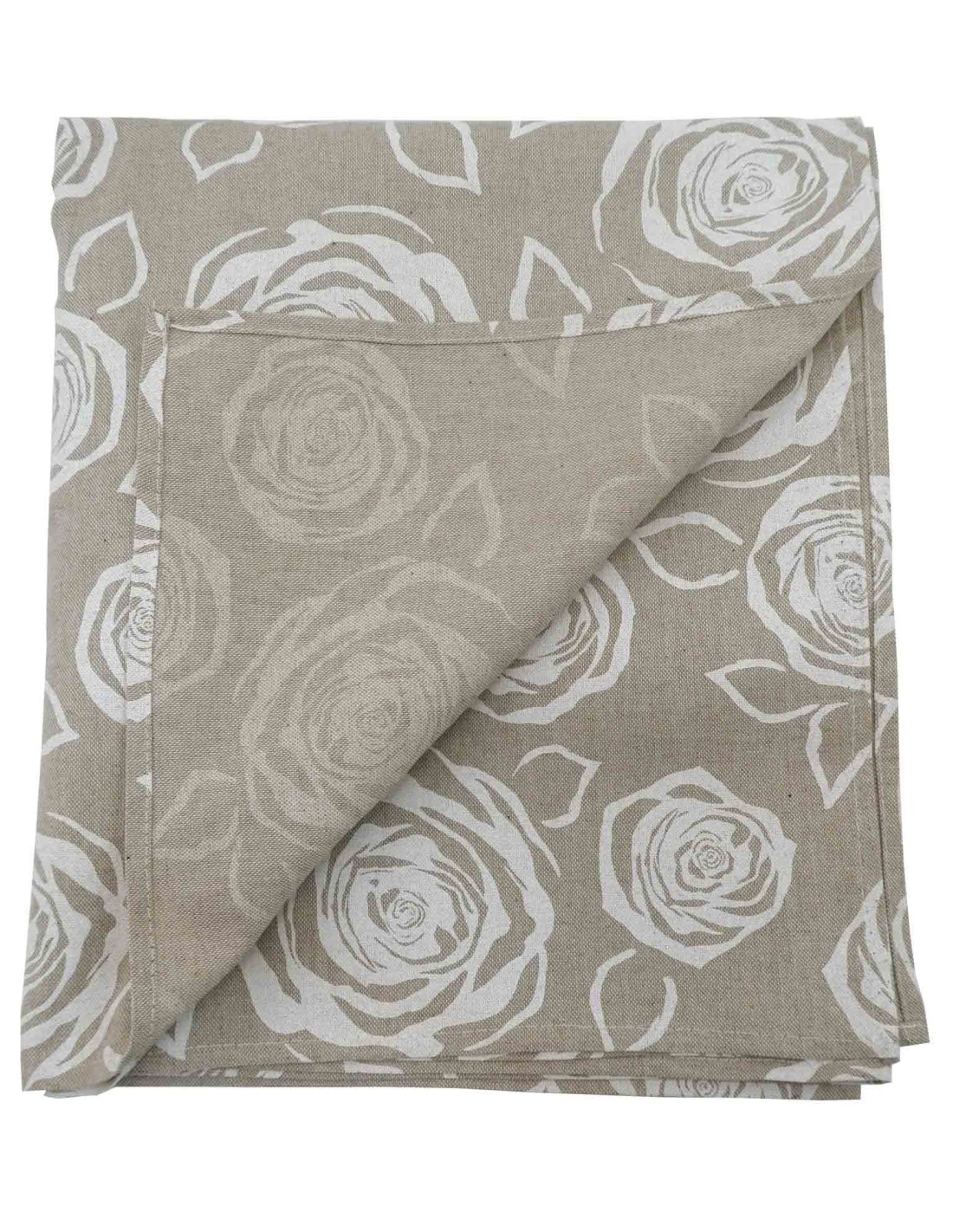 Un lienzo de algodón con una mano consistente y coloración natural que recuerda al cáñamo, enriquecido por un estampado claro con rosas estilizadas de varios tamaños que se visten por toda la mesa de su comedor..