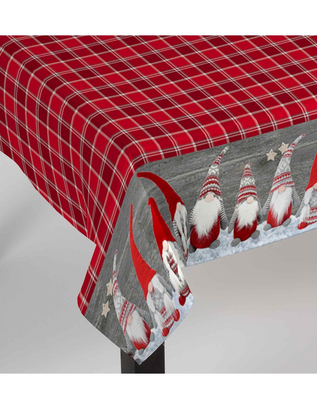 Un mantel muy bonito perfecto para la Navidad creado a partir de un lienzo de algodón puro adornado con una impresión digital colocada, un tablero de ajedrez rojo con un alegre montón de lindos gnomos que enmarcan ..