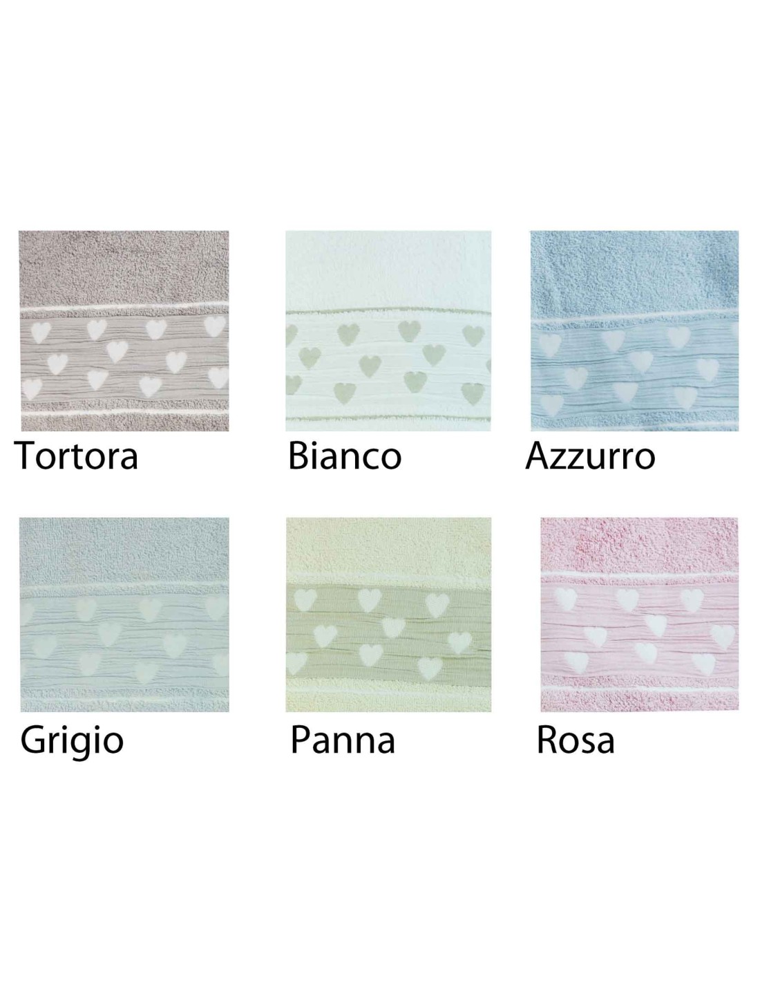 toallas 100% algodón del buen peso clásico creado por el proceso esponja ricciolini y adornada por una banda de tejido plisado irregular en el que están bordadas cuorini en tono con la esponja.