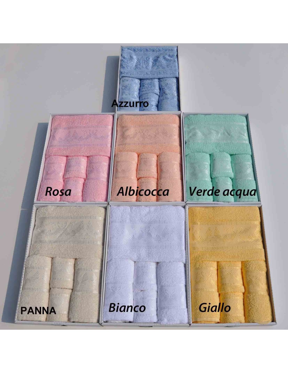 El juego de 5 piezas contiene 2 toallas de 60x100 cm, 2 invitados de 40x60 cm y una toalla de 100x150 cm..