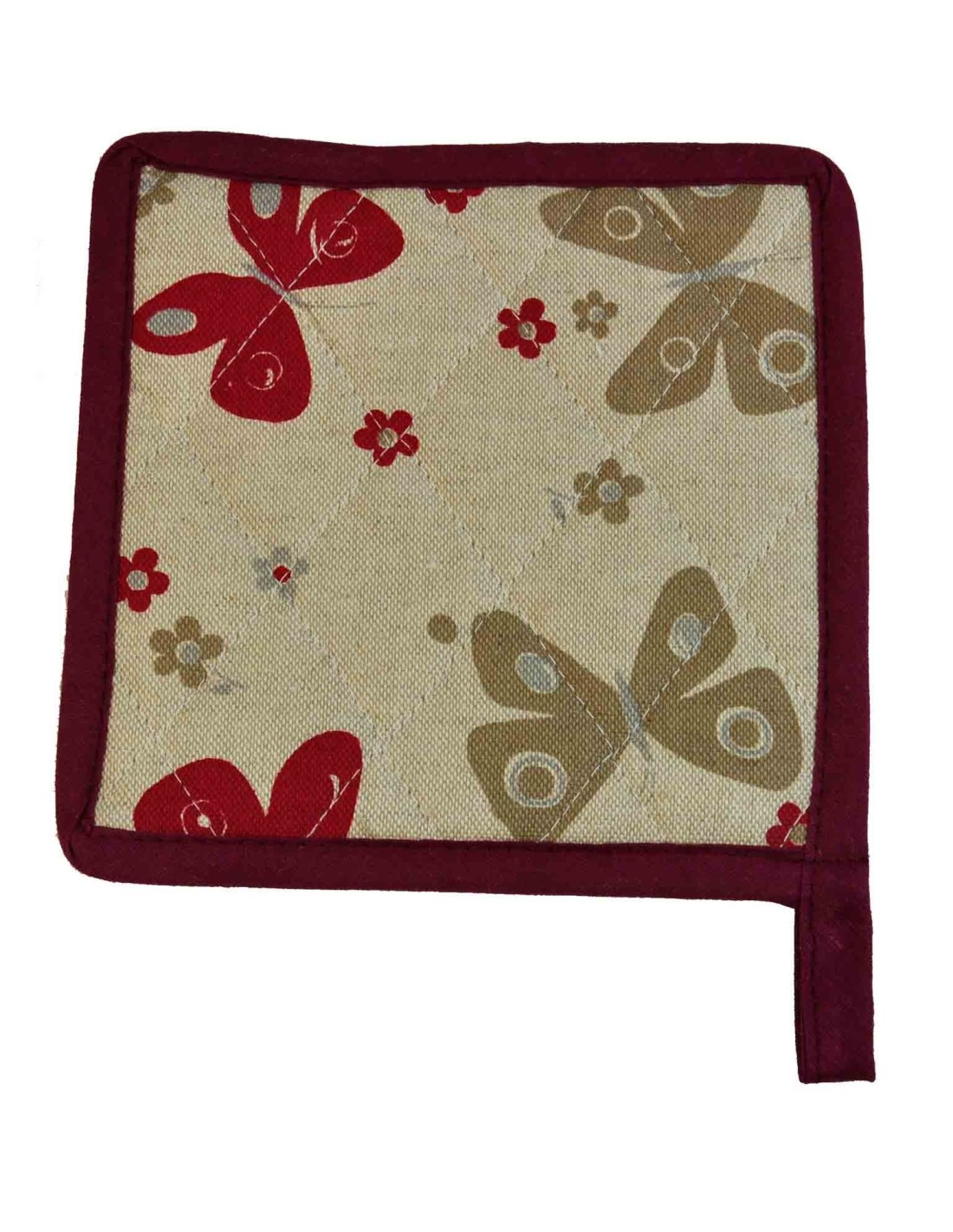 Deux couches de ce tissu contiennent mince rembourrage Center pour s’offrir une bonne prise en main mais nécessaire pour ne pas se brûler. L’ensemble est matelassé et fini avec une élingue en solide presse bords 4 côtés et forme sur un coin de la capture pour accrocher confortablement...