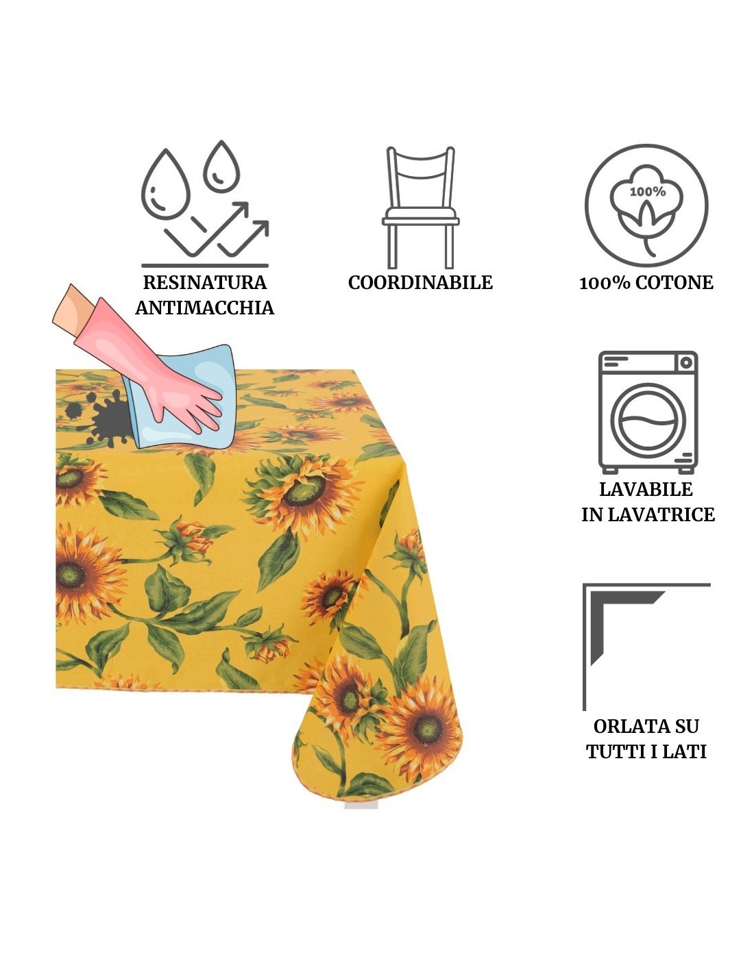RESINATA: Une nappe avec le bon compromis entre coton et cire, est en fait en pur coton mais grâce au traitement de résine en surface, un passage d’éponge suffira pour la nettoyer et si cela ne suffit pas, vous pouvez également la laver dans la machine à laver et la repasser à l’envers. Le revêtement en résine le rend moins sale et peu absorbant..