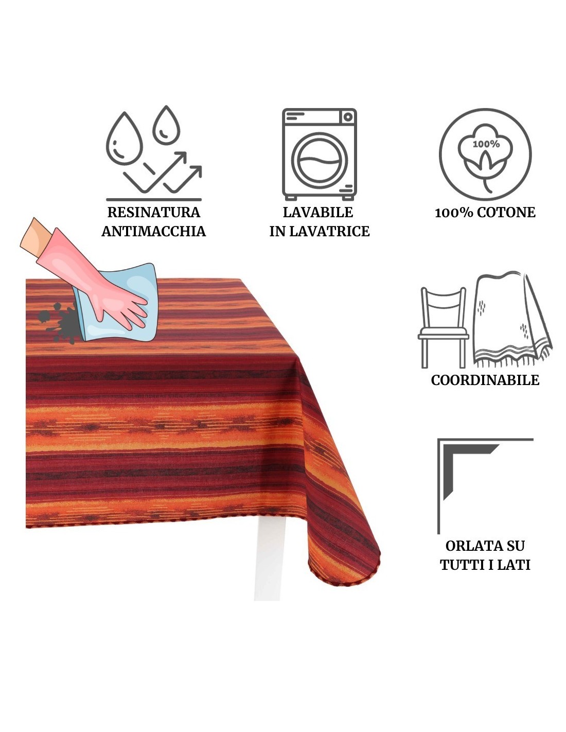Une nappe avec le bon compromis entre le coton et la cire, est en fait en pur coton mais grâce au traitement à la résine sur la surface, un passage éponge suffira à la nettoyer et si cela ne suffisait pas, vous pouvez également la laver dans la machine à laver et la repasser à l’envers. Le revêtement en résine le rend moins sale et peu absorbant..