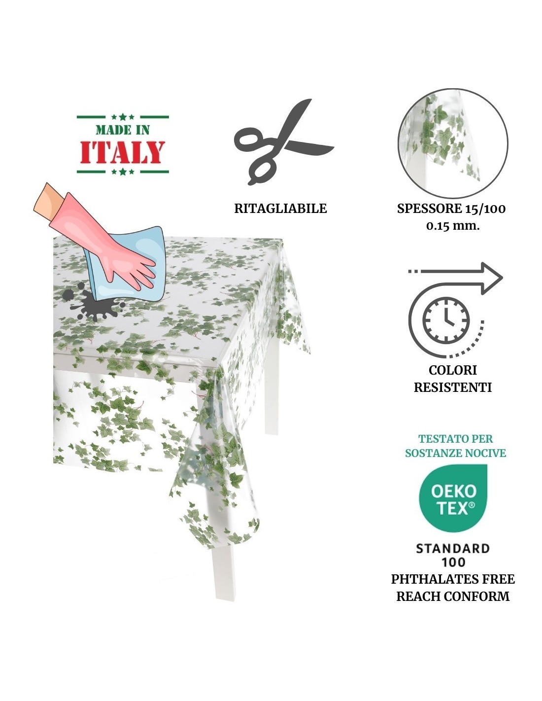 FONCTIONNALITÉS: Nappe entièrement fabriquée en Italie composée d’une feuille de vinyle imprimée sur une base transparente. Vendue sans finition, elle ne s’arrache pas, coupée brute dans de nombreuses tailles standards et même au mètre pour une nappe sur mesure ou pour des tables plus grandes.