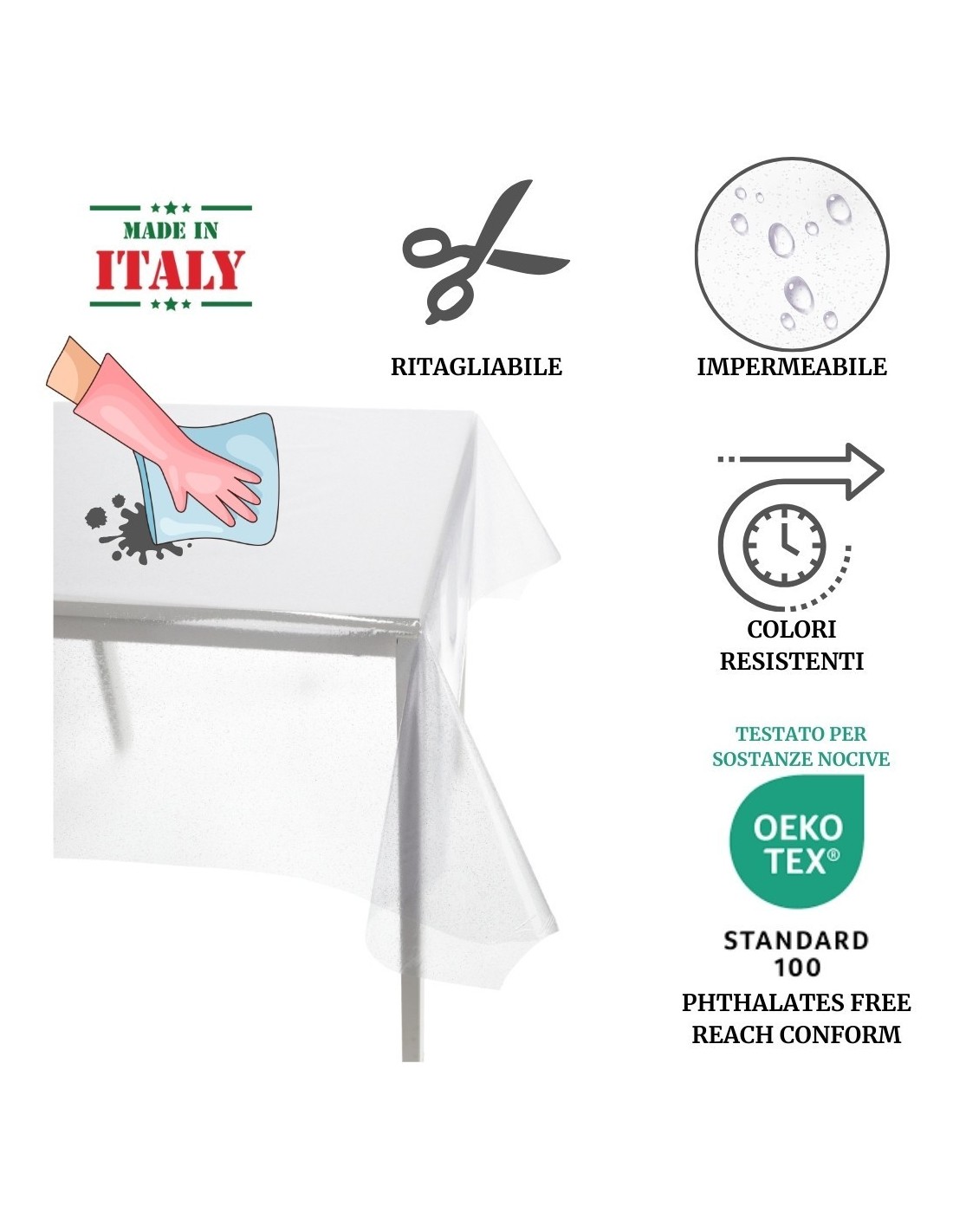 FONCTIONNALITÉS: Nappe entièrement produite en Italie composée d’une feuille de vinyle transparent ornée de paillettes chatoyantes qui donnent de la luminosité. Vendu sans finition, il ne glisse pas, coupé brut dans de nombreuses tailles standards et même au mètre pour une nappe sur mesure ou pour les tables les plus nombreuses..