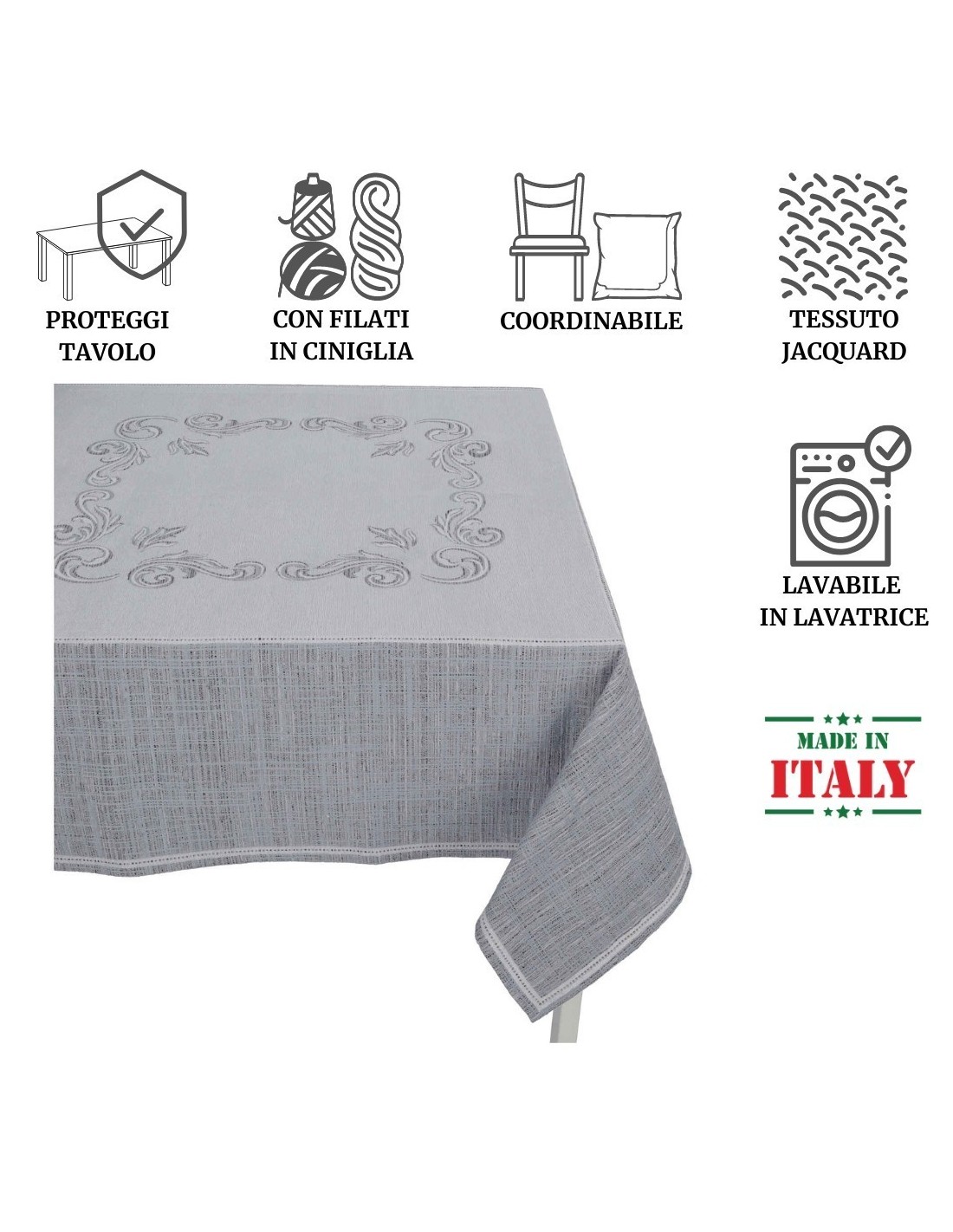 COORDINATEUR: Une collection chenille jacquard avec des couleurs vives et des motifs placés pour embellir et rendre votre maison plus fonctionnelle avec des articles modernes et captivants: en fait, en plus de la nappe, des coussins de chaise sont disponibles.