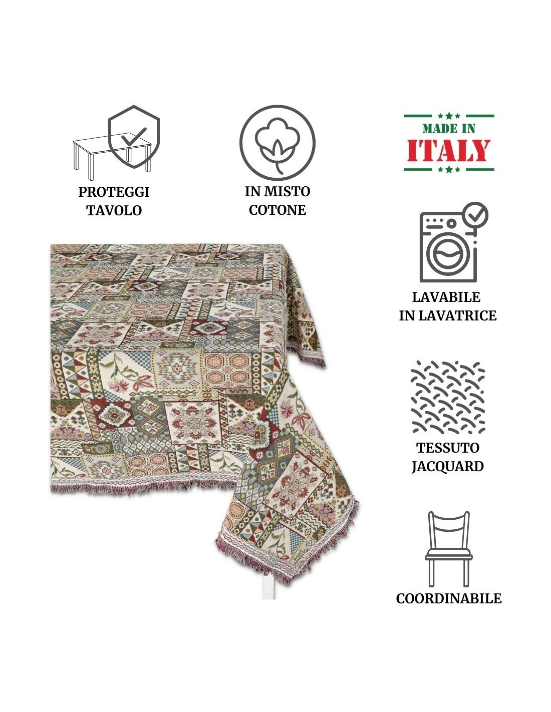 FONCTIONNALITÉS: Pas une simple nappe mais un tapis de table GOBELIN dont le motif, non imprimé, est créé directement en tissage grâce au procédé jacquard avec l’utilisation de fils épais et consistants qui lui donnent du corps et un bon poids. Cela vous garantira une stabilité dans le design et les couleurs lavage après lavage..