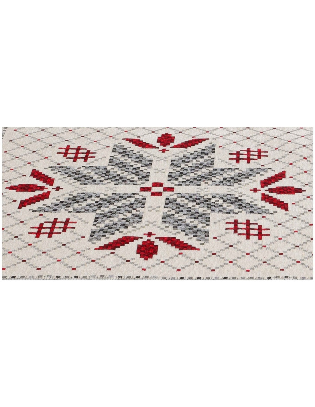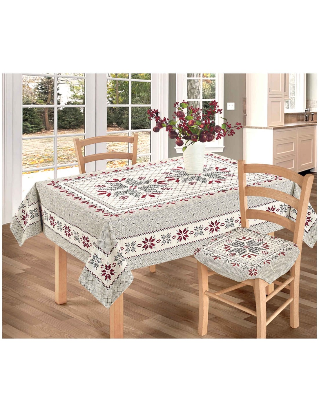 Flocons de neige stylisés dans les tons de gris et de bordeaux positionnés à la fois dans le cantro de la table et comme un joli grec dans la partie inférieure de la nappe.