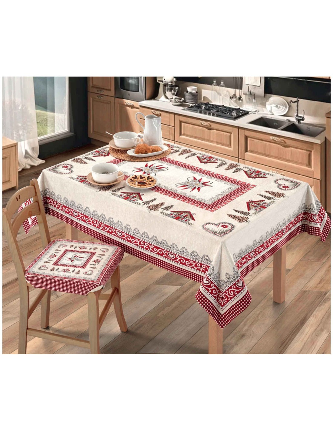 Une nappe placée dans un style tyrolien complet, idéale pour les maisons de montagne, avec des échecs blancs et rouges agrémentés de cœurs, de maisons et de fleurs.