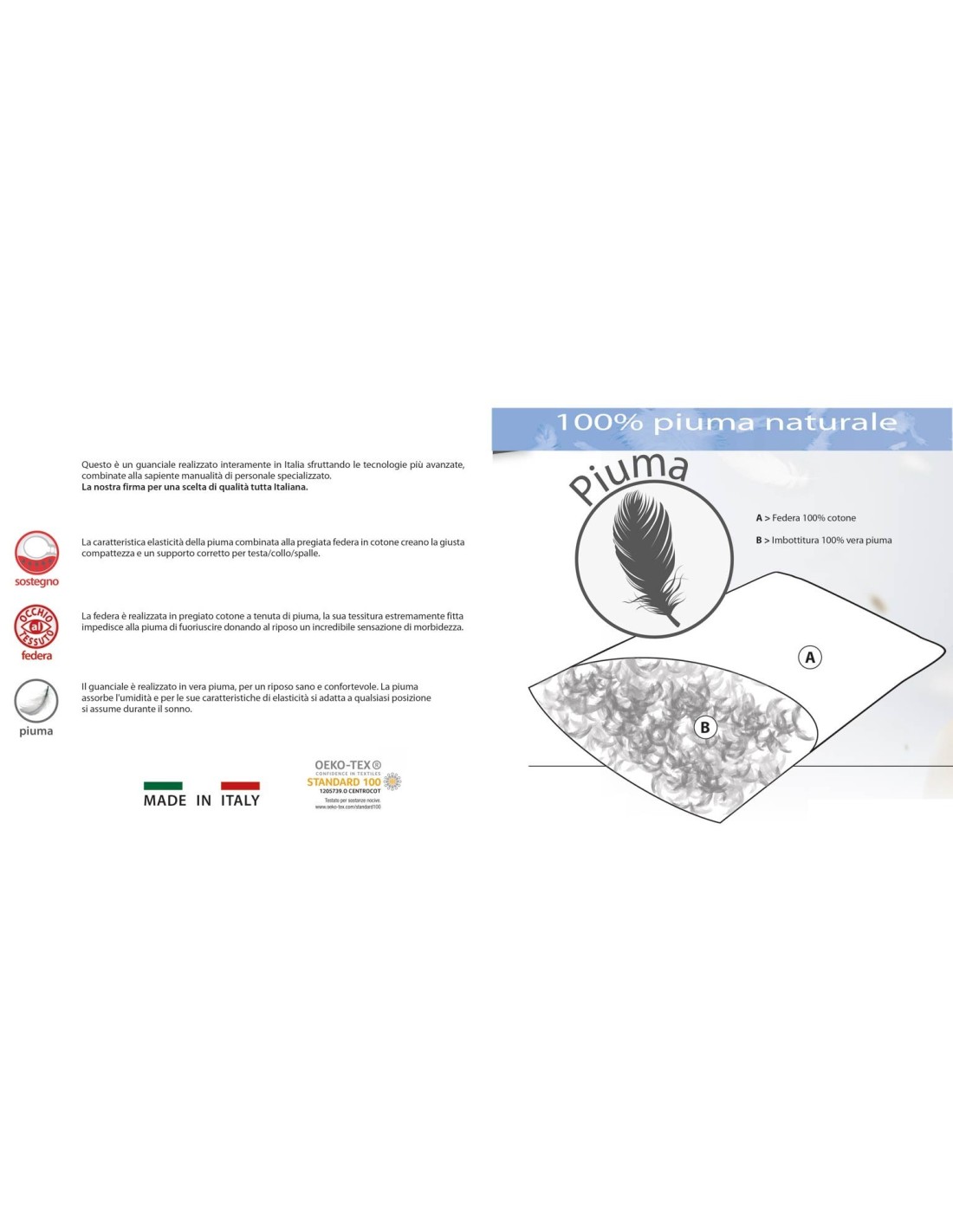Coussin de lit en plume 100% naturelle, mesurant 50x80 cm. D’une hauteur de 16 cm, respirant et compact, il soutient correctement la tête, le cou et les épaules..