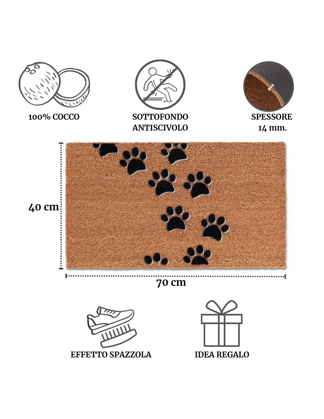 TAILLE: Le paillasson mesure 40x70 cm. et a une épaisseur de 14 mm..